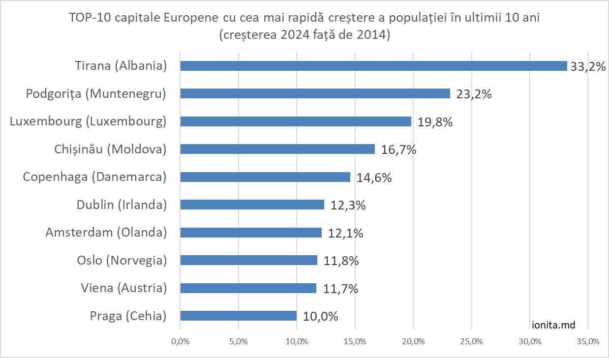 Populația municipiului a crescut de la 620.000 în 2014 la 720.000 în 2024, o creștere spectaculoasă de 100.000 de locuitori, adică aproape 17%. Dintre capitalele europene comparabile ca dimensiune sau mai mari, niciuna nu a avut o asemenea evoluție. Doar Tirana, Podgorica și Luxemburg – capitale mult mai mici – au înregistrat creșteri mai rapide, dar la o scară total diferită.