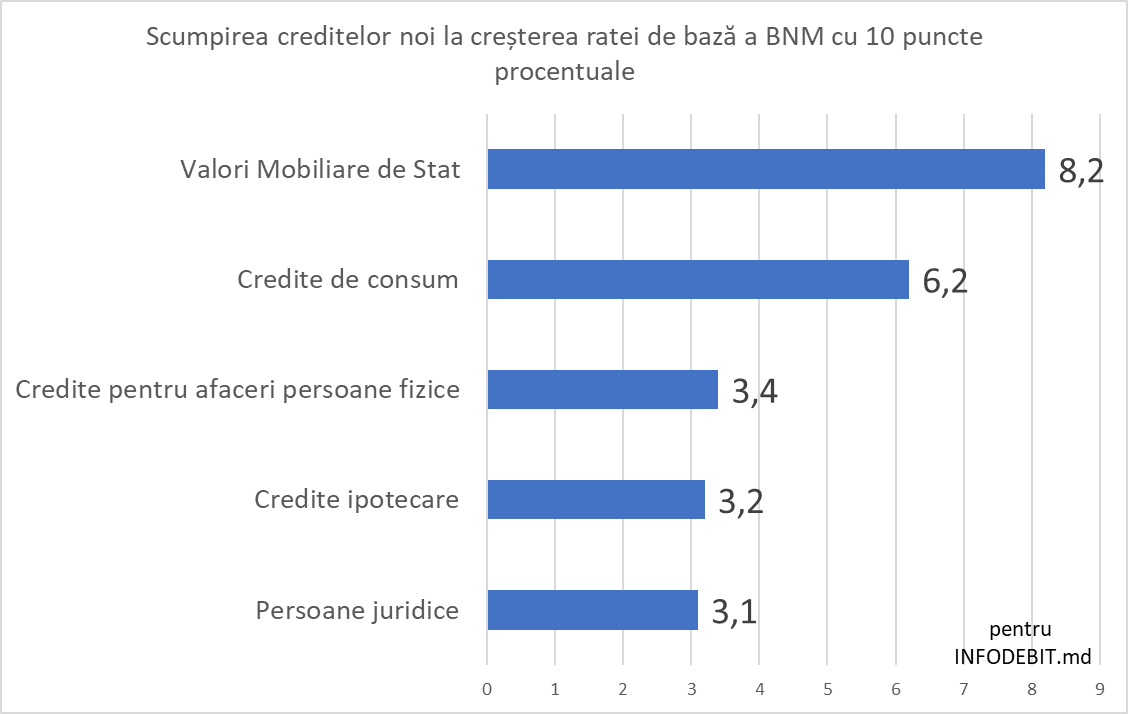 ➡️ La o creștere de 10 p.p. a ratei de bază, creditele de consum se scumpesc cu 6,2 p.p.