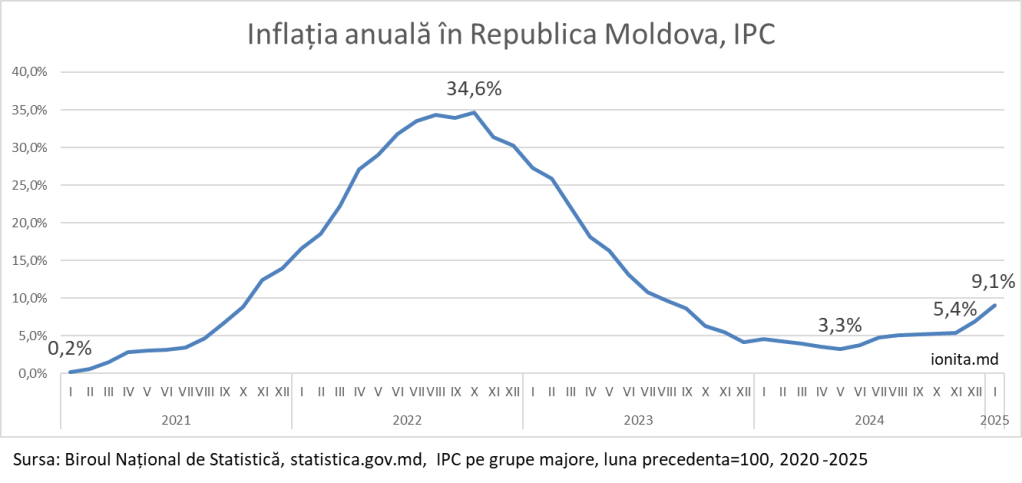 În ultimele două luni, inflația în Republica Moldova a ajuns la 9,1% în termeni anuali, cu un record de 2,8% doar în luna ianuarie. Ultima dată o creștere mai mare a prețurilor a fost în aprilie 2022, când Moldova a trecut prin cea mai puternică inflație din ultimele două decenii.
