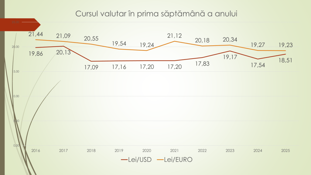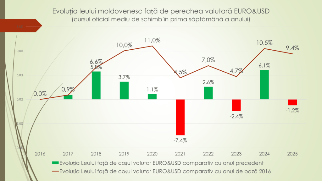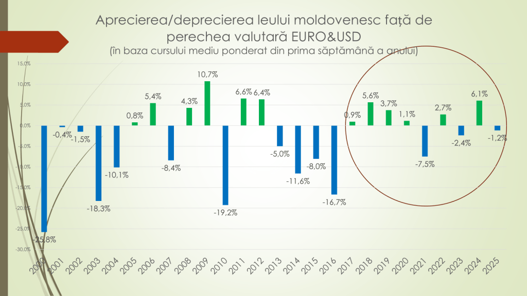 Expertul a făcut mai multe analize asupra evoluției leului în prima săptămână a anului. Astfel, în prima săptămână din 2025 a fost, față de euro și dolar, cu 1,2% mai slab față de prima săptămână din 2024. Anul trecut, în prima săptămână se apreciase cu 6,1% față de prima săptămână din 2023. „Din 2016 și până în 2025, leul moldovenesc s-a depreciat în trei ani. În restul anilor – s-a apreciat. În acest an, leul este cu 9,4% mai puternic, față de euro și dolar, comparativ cu 2016. Dacă în 2016, în prima săptămână a anului, un dolar costa 19,86 lei, iar un euro – 21,44 lei, în prima săptămână din 2025, un dolar a ajuns să coste 18,51 lei, iar un euro – 19,23 lei. În cazul euro, niciodată după 2016 nu a fost acest curs. În cazul dolarului – este un pic mai puternic”, a spus expertul.