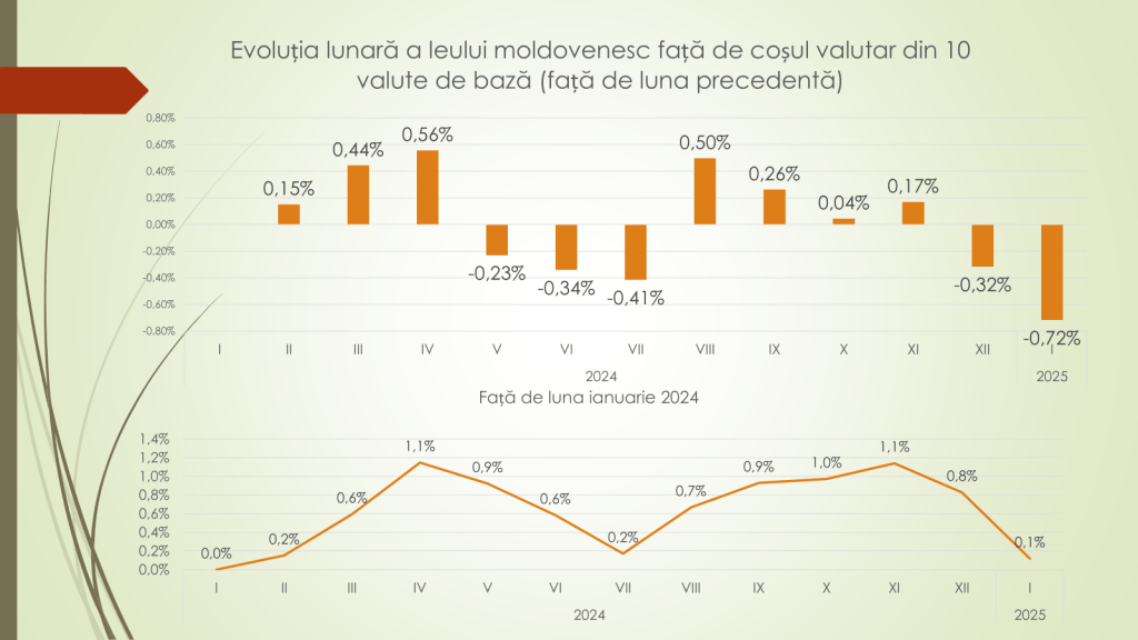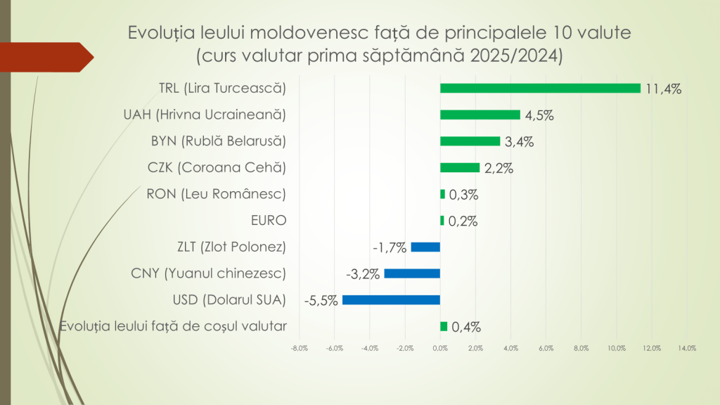 Veaceslav Ioniță susține că în prima săptămână din 2025, față de prima săptămână din 2024, leul moldovenesc s-a întărit față de lira turcească, hrivna ucraineană, rubla belarusă, coroana cehă, leul românesc și euro, dar s-a depreciat față de zlotul polonez, yuanul chinezesc și dolarul american. Însă, față de toate valutele luate la un loc, în prima săptămână din 2025 s-a întărit cu 0,4% față de prima săptămână din 2024. „Leul moldovenesc, indiferent ce se petrece pe parcursul anului pe piața valutară, anul îl începe la același nivel, chiar dacă mai puternic”, susține Veaceslav Ioniță.