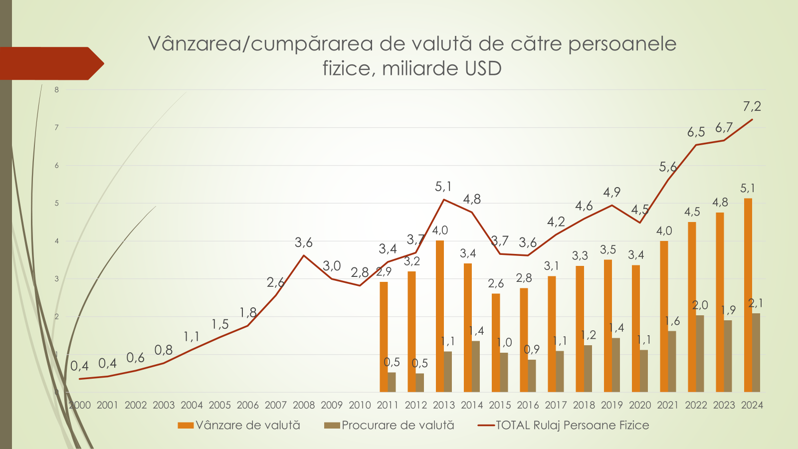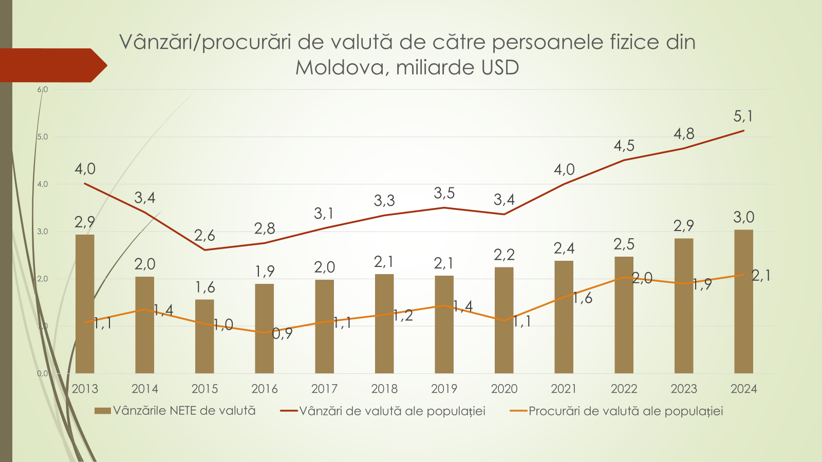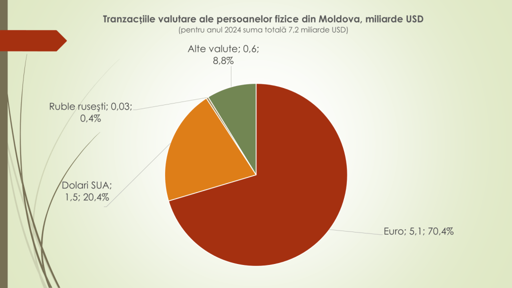Potrivit economistului, în 2024, volumul de valută cumpărat și vândut de către moldoveni a fost de 7,2 mild/USD. În creștere cu 500 mil/USD față de 2023. Moldovenii au vândut 5,1 mild/USD, dar au cumpărat 2,1 mild/USD. Astfel, pe piața valutară, în 2024, au intrat 3 mild/USD. Cu referire la tranzacțiile valutare ale moldovenilor din 2024, economistul a menționat că din cele 7,2 mild/USD: 5,1 mild/USD sau 70,4% au fost în euro; 1,5 mild/USD sau 20,4% – în dolari; 0,6 mild/USD sau 8,8% – în alte valute, iar 0,03 mild/USD sau 0,4% în ruble rusești.