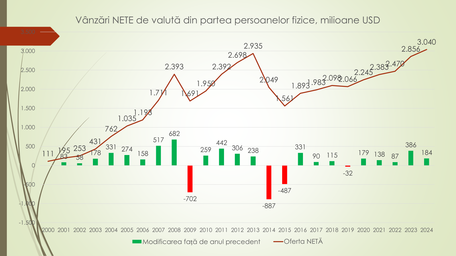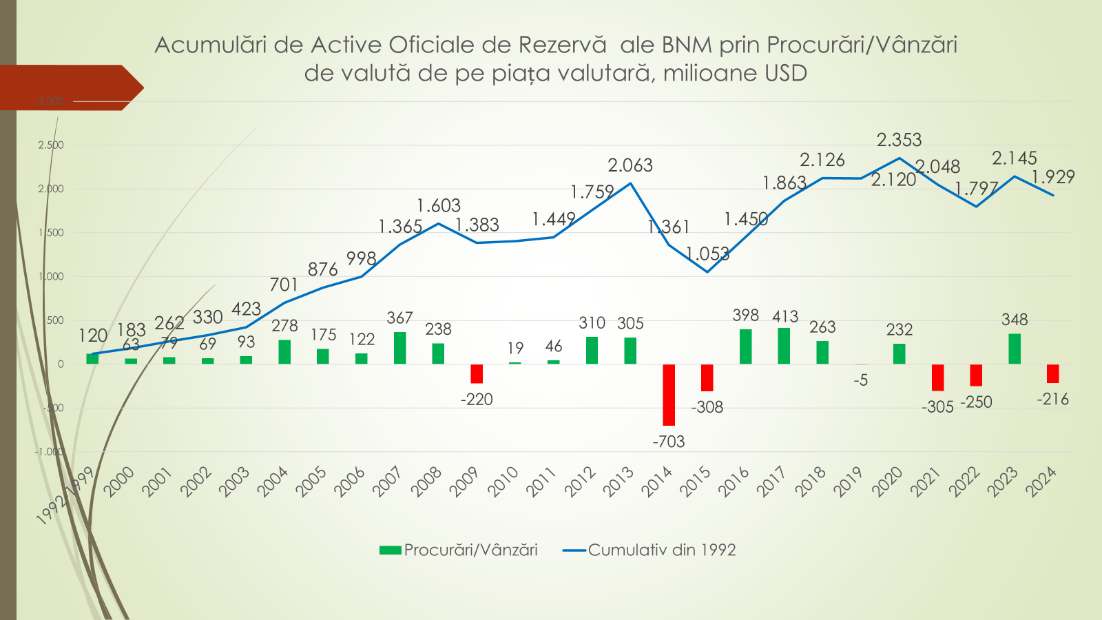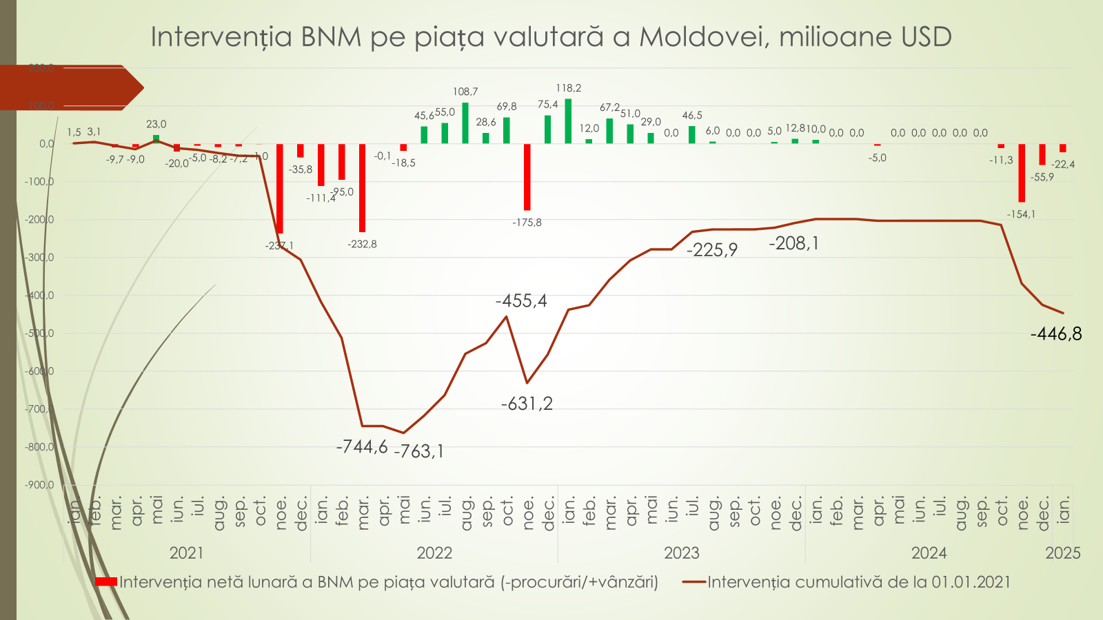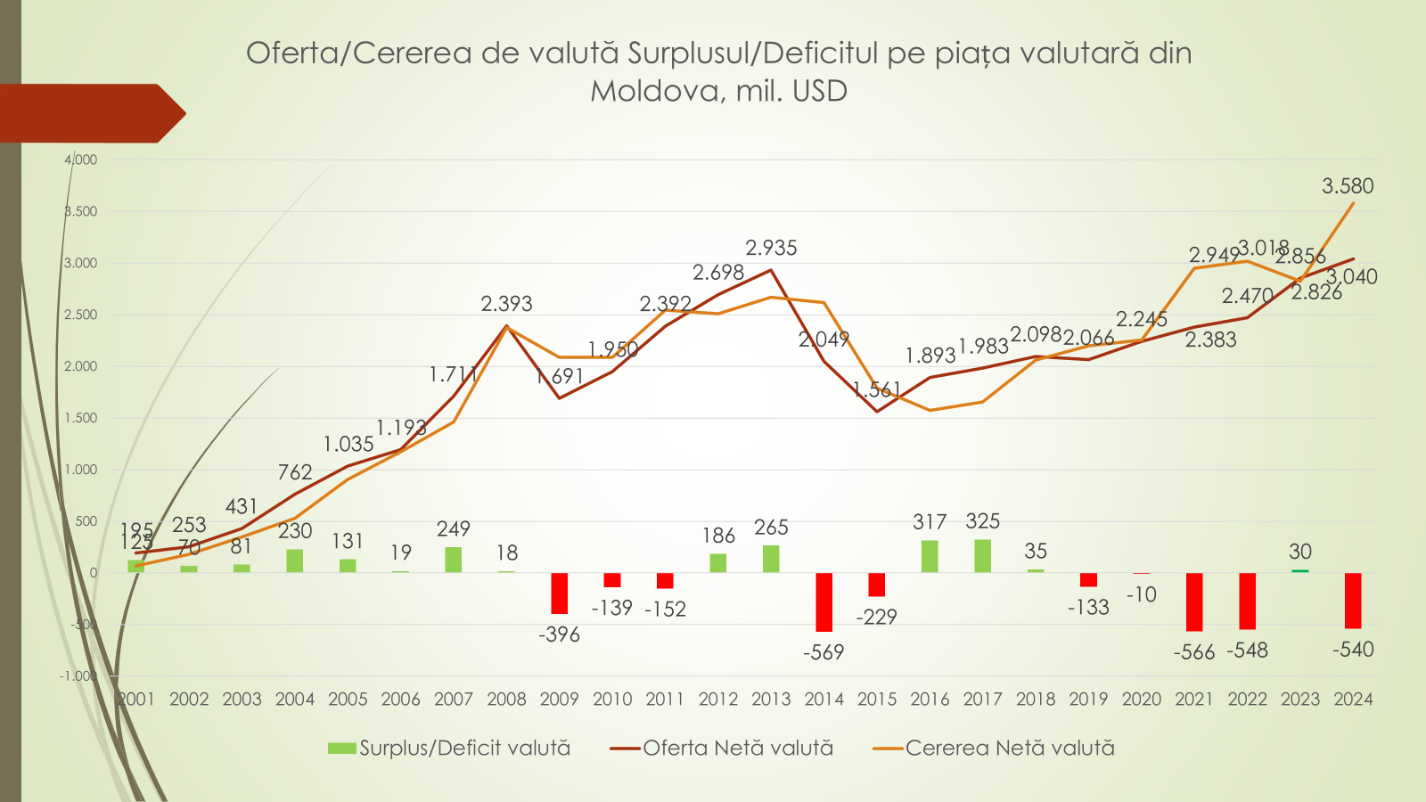 Potrivit expertului, aproape în toți anii, cererea și oferta de valută a fost egală. Totuși, în 2024 a fost înregistrată o cerere de valută mai mare decât oferta de 540 mil/USD, deoarece în decembrie din 2024, brusc au crescut prețurile de import al resurselor energetice, dar și faptul că în luna decembrie, populația vinde puțină valută. „Chiar dacă în ultimii ani este un deficit de valută, din cauza că sunt câteva crize energetice, totuși rezervele valutare ale BNM permite intervenția pe piață. În luna ianuarie, BNM a intervenit cu aproape 447 mil/USD din rezerve”, potrivit expertului.