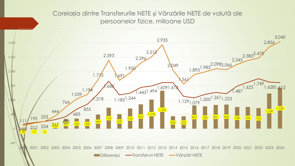 Analistul economic a afirmat că în 2024, transferurile către persoanele fizice au fost de 1,6 mild/USD, iar vânzările de valută ale persoanelor fizice – 3 mild/USD. Astfel, s-a înregistrat un surplus neoficial de valută pe piață 1,4 mild/USD. Analistul economic susține că o parte din acești bani au venit de la cetățenii ucraineni, care s-au refugiat în Republica Moldova.
