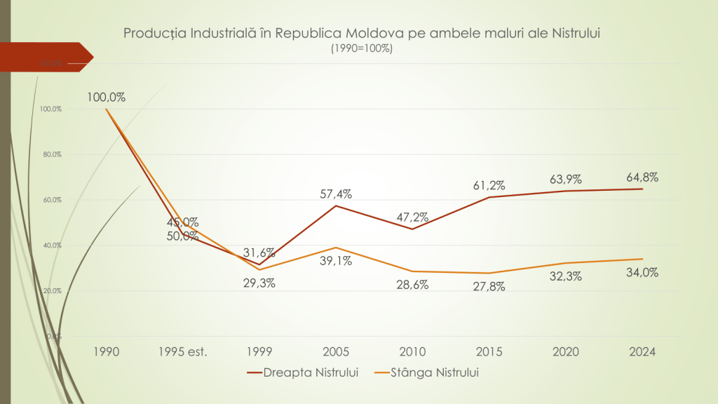 Cu referire la volumul producției industriale, raportat la PIB, Veaceslav Ioniță a spus că în 1990 a fost de 87%; în 2000 – 42,7%; 2010 – 32,6%; 2020 – 29,9%; iar în 2024, estimativ va fi 26,9%. Despre producția industrială a Republica Moldova, pe ambele maluri ale Nistrului, față de 1990, când a fost cea mai bună stare de lucruri, aceasta în 1995 a atins, în dreapta Nistrului – 45% din nivelul anului 1990, iar în stânga Nistrului – 50% din nivelul anului 1990. În 2005: dreapta Nistrului – 57,4%, iar stânga Nistrului – 39,1%. 2010: dreapta Nistrului – 61,2%; stânga Nistrului – 27,8%. 2014: dreapta Nistrului – 64,8%, iar stânga Nistrului – 34%. „După 2010, în dreapta Nistrului a crescut mai rapid, iar în stânga Nistrului practic stagnează. Acum în stânga Nistrului multe întreprinderi își au suspendată activitatea, situația devine mai proastă de două ori față de a noastră”, a spus Veaceslav Ioniță.