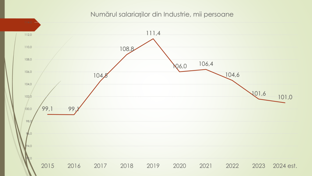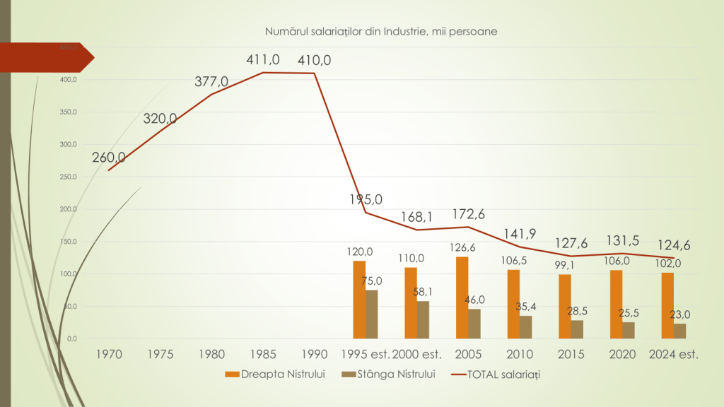 Vorbind despre salariații din industrie, economistul a menționat că se înregistrează o scădere puternică. În 1970 erau 260 mii/persoane; în 1985 a crescut la 411 mii/persoane. În 1990 a scăzut la 410 mii/persoane; iar în 1995 la 195 mii/persoane, inclusiv 120 mii/persoane în dreapta Nistrului. În 2000 erau 168,1 mii/persoane, dintre care 110 mii/persoane în dreapta Nistrului. 2005 – 172,6 mii/persoane, inclusiv 126,6 mii/persoane în dreapta Nistrului. 2015 – 127,6 mii/persoane, dintre care 99,1 mii/persoane în dreapta Nistrului; 2020 – 131,5 mii/persoane, dintre care 106 mii/persoane în dreapta Nistrului. 2024 – 124,6 mii/persoane, inclusiv 101 mii/persoane în dreapta Nistrului.
