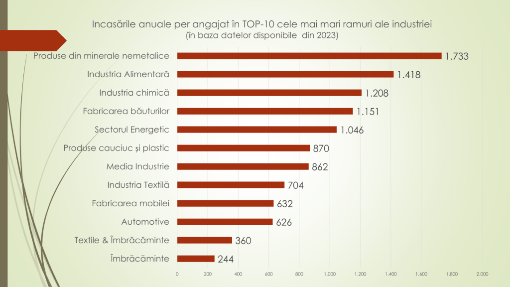 În baza datelor din 2023, expertul a menționat că încasările anuale per angajat în ramura de produse din minerale nemetalice au fost de 1,7 mil/lei; în industria alimentară – 1,4 mil/lei; industria chimică – 1,2 mil/lei; fabricarea băuturilor – 1,1 mil/lei; sectorul energetic – 1 mil/lei; produse din cauciuc și plastic – 870 mii/lei; media pe industrie – 862 mii/lei; industria textilă – 704 mii/lei; fabricarea mobilei – 632 mii/lei; automotive – 626 mii/lei; textile și îmbrăcăminte – 360 mii/lei; iar doar de la îmbrăcăminte – 244 mii/lei. Despre ponderea cheltuielilor pentru forța de muncă din totalul încasărilor, expertul a menționat că în 2005 a reprezentat 15,2%; în 2009 – 18,9%; 2010 – 16,3%; 2015 – 17,2%; 2020 – 21%; 2022 – 18,5%; iar în 2024 – 21,8%. „În ultimii doi ani, presiunea salarială în industrie a crescut cu aproape 20%”, a menționat expertul.