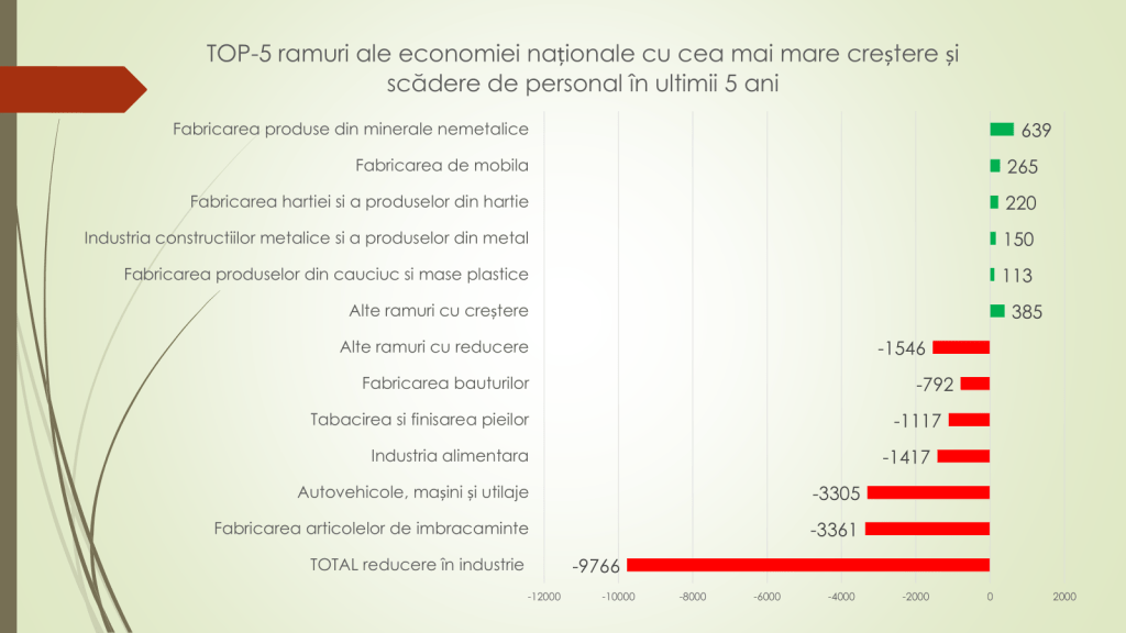 Veaceslav Ioniță a făcut un top 5 ramuri ale economiei cu cea mai mare creștere și scădere de personal în ultimii 5 ani. Astfel, creșteri de personal au înregistrat ramurile: fabricarea de produse din minerale nemetalice – 639 persoane; fabricarea de mobilă – 265 persoane; fabricarea hârtiei și a produselor din hârtie – 220 persoane; industria construcțiilor metalice și a produselor din metal – 150 persoane; fabricarea produselor din cauciuc și plastic – 113 persoane; alte ramuri au avut creșteri de 385 persoane. Scăderi au înregistrat ramurile: fabricarea articolelor de îmbrăcăminte – 3361 de persoane; autovehicule, mașini și utilaje – 3305 persoane; industria alimentară – 1417 persoane; tăbăcirea și finisarea pieilor – 1117 persoane; fabricarea băuturilor – 792 persoane; iar alte ramuri au avut un minus de 1546 persoane. „În total, scăderea pe industrie este de 9766 de persoane în ultimii cinci ani. Nu există o claritate cum se poate dezvolta industria moldovenească, lucru care crează stagnări, scăderi și plecări din sector”, a menționat Veaceslav Ioniță.