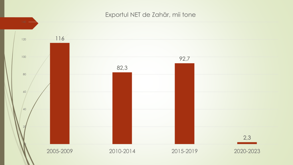 Cu referire la exportul net de zahăr, expertul a menționat că între 2005/2009 a fost de 116 mii/tone; între 2010/2014 – 82,3 mii/tone; 2015/2019 – 92,7 mii/tone; iar între 2020/2023 – doar 2,3 mii/tone. „Aceasta stare arată că în viitorul apropiat vom ajunge la importul masiv de zahăr. Ne transformăm în importatori de produse finite și exportatori de materie primă”, constată expertul.
