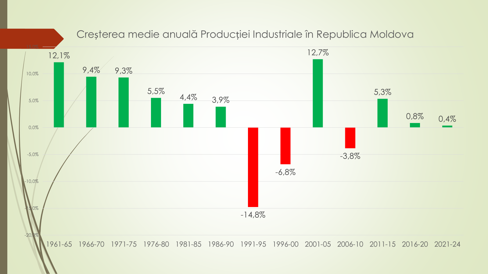 Față de 1990, când a fost cea mai bună situație, industria Republicii Moldova a fost în 1950 – 2,7% din nivelul anului 1990; în 1970 – 32,7%; 1999 – 31,6%; 2010 – 47,2%; 2020 – 63,9%; 2021 – 71,6%; iar în 2024 – 64,8% din valoarea anului 1990. „Până la valoarea anului 1990, dacă mergem cu ritmul de până acum, cred că în 2040 vom atinge nivelul dat. Nu vorbim de dezvoltare, dar recuperarea nivelului din 1990. În prezent, ritmul de creștere al industriei noastre este foarte slab”, a declarat expertul.