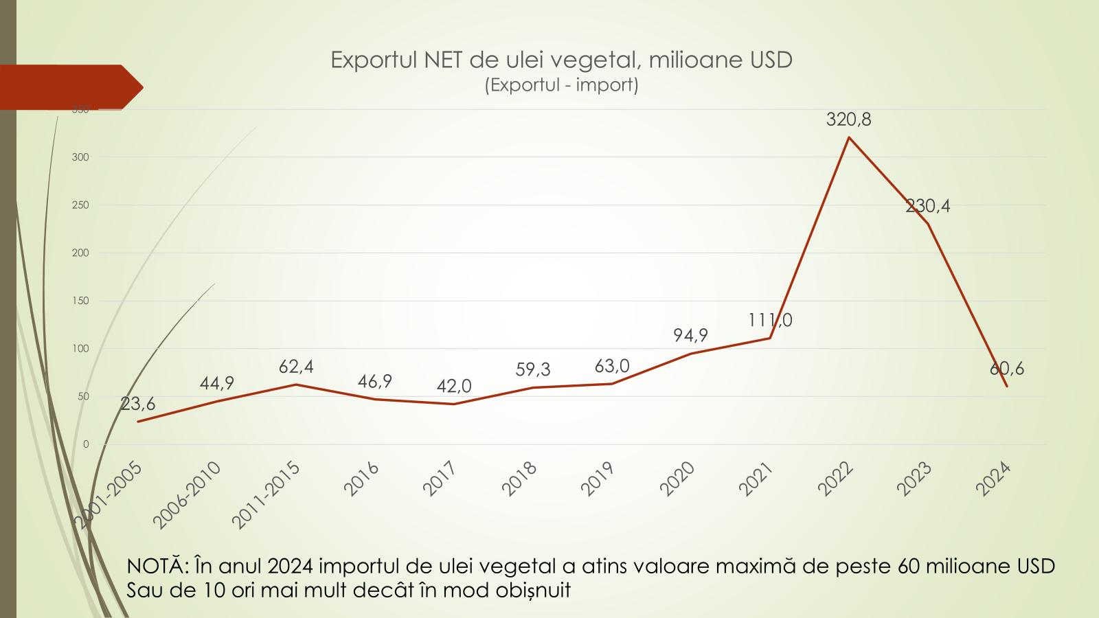 Despre exportul net de ulei vegetal, economistul susține că între 2001/2005 a fost de 23,6 mil/USD; între 2011/2015 – de 62,4 mil/USD; 2020 – 94,0 mil/USD; 2022 – 320,8 mil/USD; iar în 2024 – 60,6 mil/USD. „În 2024, importul de ulei vegetal a atins valoare maximă de peste 60 mil/USD. De 10 ori mai mult decât în mod obișnuit. Situația este mai gravă decât la zahăr. Anul 2024 va intra în istorie ca anul în care am importat ulei vegetal de 60 mil/USD”, a conchis economistul.