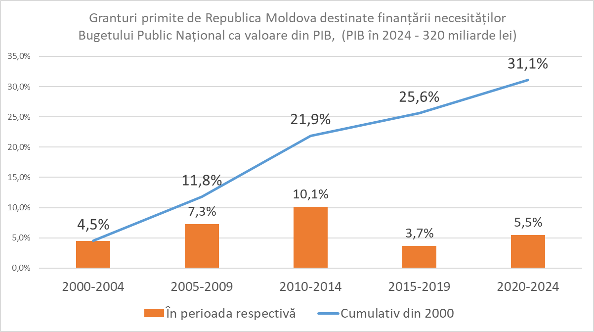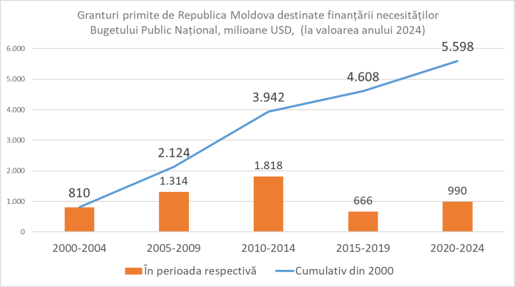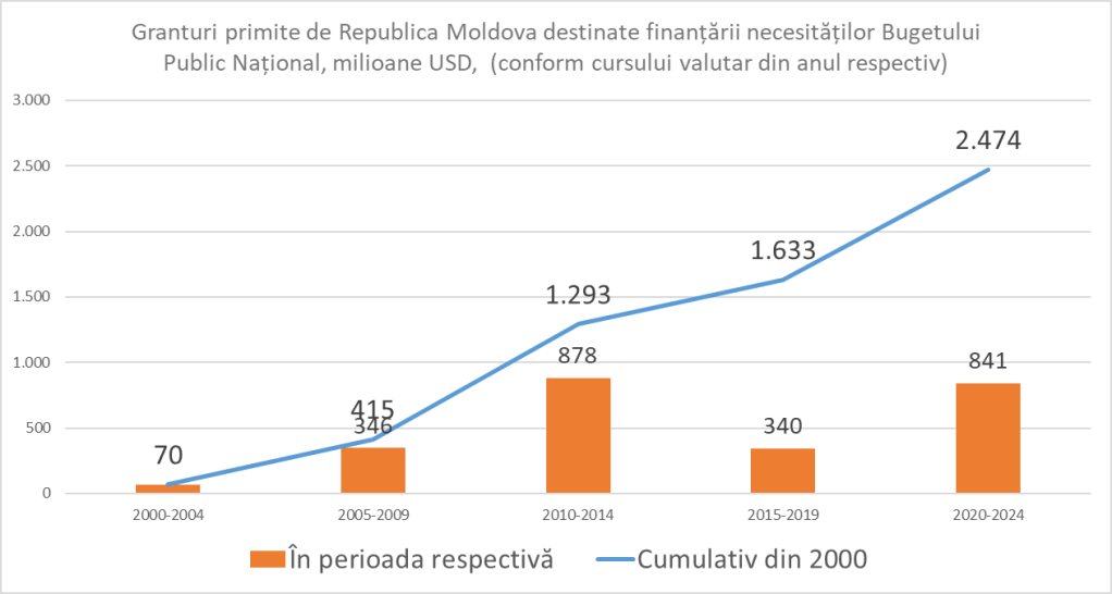 În ultimii 25 de ani, Guvernul Republici Moldova a beneficiat de aproape 2,5 miliarde de dolari sub formă de granturi care au intrat direct în bugetul public național. Această sumă este, totuși, doar o parte din finanțarea externă totală, deoarece multe granturi au fost gestionate direct de donatori, fără a trece prin administrația națională.