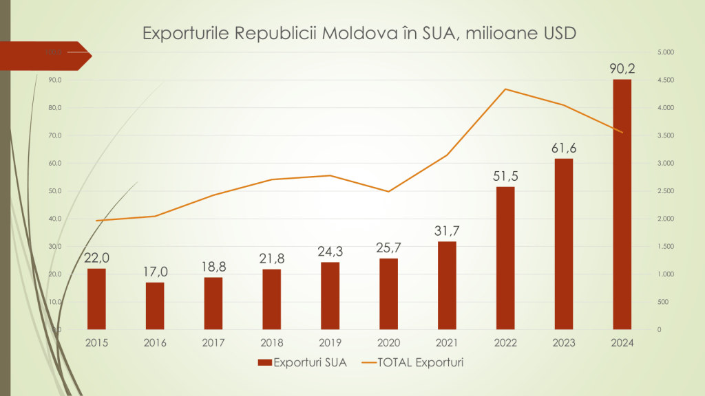 Potrivit expertului, exporturile Republicii Moldova în SUA în 2015 au totalizat 22 mil/USD. În 2016 – 17 mil/USD; 2018 – 21,8 mil/USD; 2019 – 24,3 mil/USD; 2021 – 31,7 mil/USD; 2022 – 51,5 mil/USD; 2023 – 61,6 mil/USD; iar în 2024 – 90,2 mil/USD. „Doi ani la rând, 2023 și 2024, exporturile moldovenești în alte țări în general scad, însă către SUA au fost în creștere. Exact când a început a crește comerțul nostru cu SUA, ne sunt impuse noi tarife”, spune expertul.