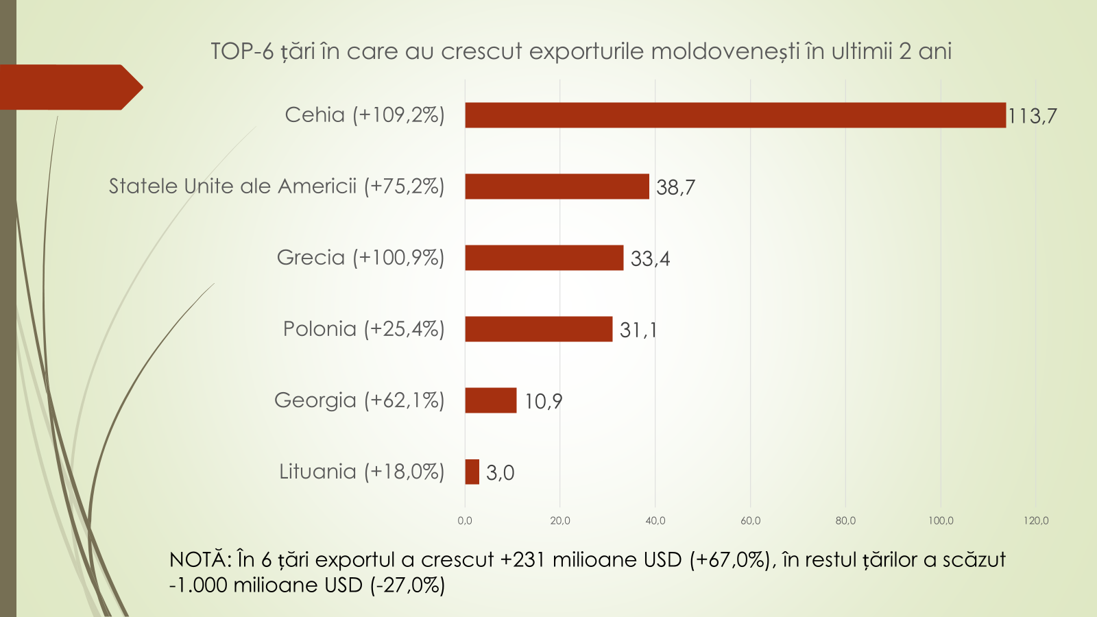 Veaceslav Ioniță susține că sunt doar șase state unde în acești doi ani exporturile moldovenești au fost în creștere. Este vorba de Cehia unde exporturile în 2023/2024 au crescut cu 113,7 mil/USD (+109,2%), SUA – +38,7 mil/USD (+75,2%), Grecia – +33,4 mil/USD (+100,9%), Polonia – +31,1 mil/USD (+25,4%), Georgia – +10,9 mil/USD (+62,1%) și Lituania – +3 mil/USD (+18%). „În aceste șase țări exporturile noastre au crescut cu 231 mil/USD (+67%). În cazul Cehiei este export de produse procesate a materiei prime, care nu este de origine moldovenească, pentru industria automotive. În cazul SUA este export de produse moldovenești autohtone. În restul țărilor, unde Republica Moldova realizează exporturi, acestea au scăzut cu 1 mild/USD (-27%)”, a spus Veaceslav Ioniță.