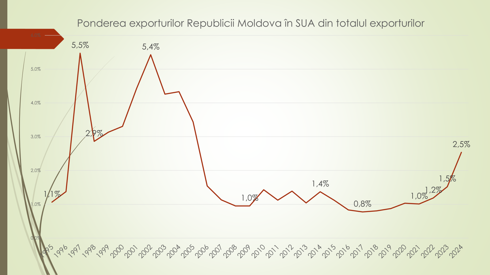 Analizând exporturile Republicii Moldova în SUA din totalul exporturilor, economistul a declarat că în 1995 acestea au reprezentat 1,1%. În 1997 – 5,5%; 1998 – 2,9%; 2002 – 5,4%; 2009 – 1%; 2014 – 1,4%; 2017 – 0,8%; 2021 – 1%; 2023 – 1,5%, iar în 2024 – 2,5%. „A fost o explozie a exporturilor către SUA în 2024. Dar mai avem de exportat până a ajunge la nivelul din anii 1997. Potențialul nostru este mare, sperăm că aceste noi tarife nu ne for afecta, dacă Guvernul va identifica agenții economici care au reușit să facă aceste exporturi în SUA pentru a-i susține să continue exporturile”, declară economistul.
