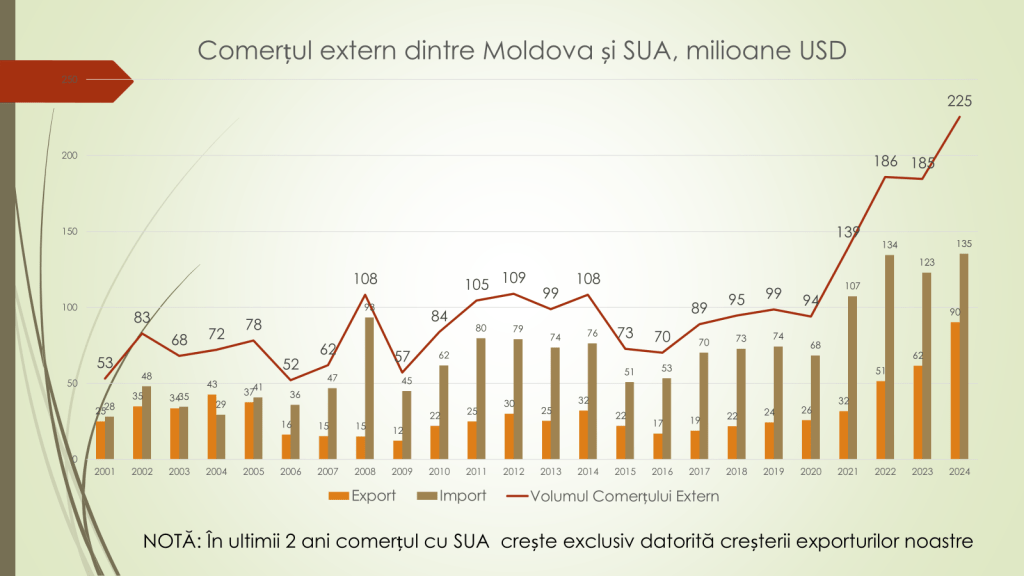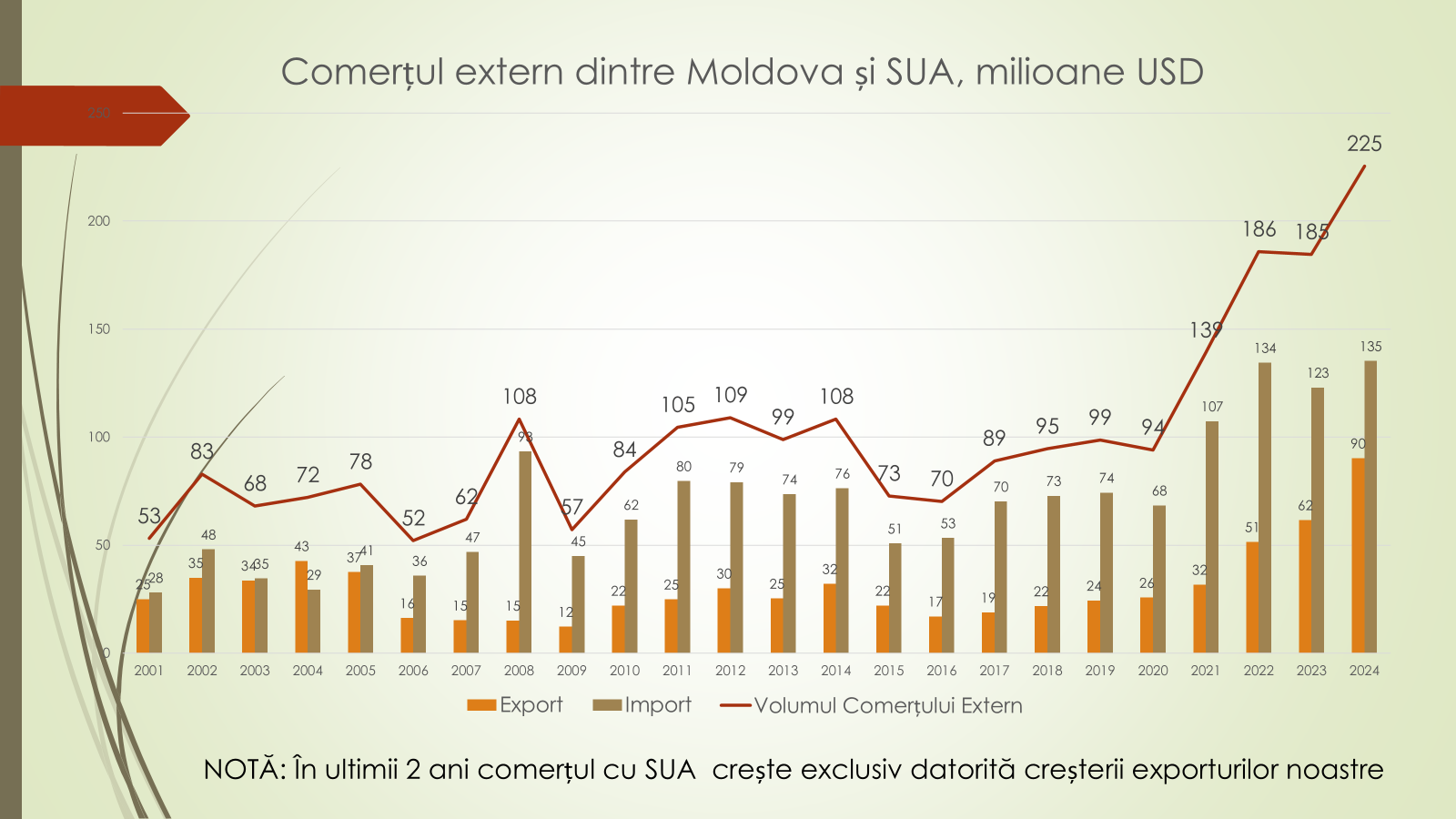 Vorbind despre comerțul extern dintre Republica Moldova și SUA, analistul economic a afirmat că în 2001 acestea au totalizat 53 mil/USD, dintre care 25 mil/USD-export, iar 28 mil/USD-import. În 2002 au fost de 83 mil/USD, inclusiv 35 mil/USD-export, iar 48 mil/USD-import. 2003 – 69 mil/USD: 34 mil/USD-export, iar 35 mil/USD-import. 2005 – 78 mil/USD: 37 mil/USD-export, iar 41 mil/USD-import. 2006 – 52 mil/USD: 16 mil/USD-export, iar 36 mil/USD-import. 2008 – 100 mil/USD: 15 mil/USD-export, iar 93 mil/USD-import. 2009 – 57 mil/USD: 12 mil/USD-export, iar 45 mil/USD-import. 2012 – 109 mil/USD: 3 mil/USD-export, iar 79 mil/USD-import. 2016 – 70 mil/USD: 17 mil/USD-export, iar 53 mil/USD-import. 2019 – 98 mil/USD: 24 mil/USD-export, iar 74 mil/USD-import. 2020 – 94 mil/USD: 26 mil/USD-export, iar 68 mil/USD-import. 2021 – 139 mil/USD: 32 mil/USD-export, iar 107 mil/USD-import. 2022 – 185 mil/USD: 51 mil/USD-export, iar 134 mil/USD-import. 2024 – 225 mil/USD: 90 mil/USD-export, iar 135 mil/USD-import.
