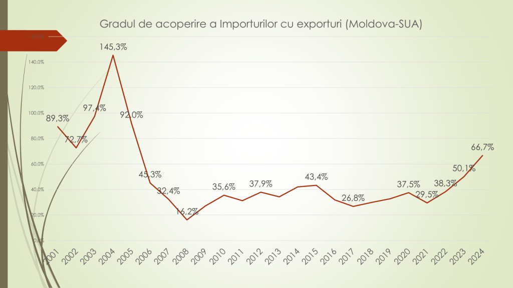 Despre gradul de acoperire al importurilor din SUA cu exporturile din Republica Moldova, expertul a menționat că în 2001 acest grad a fost de 89,3%. În 2002 – 72,7%; 2004 – 145,3%; 2008 – 16,2%; 2015 – 43,4%; 2017 – 26,8%; 2020 – 37,5%; 2021 – 29,5%; 2022 – 38,3%; iar în 2024 – 66,7%. „La noi, la fiecare 100 USD importați, 70 USD sunt exportați. A fost îmbunătățită balanța comercială cu SUA de două ori. A fost un singur an când Republica Moldova a exportat mai mult de către SUA decât a importat, în rest s-a importat de 3-4 ori mai mult. Datorită creșterii bruște a exporturilor din ultimii doi ani, Republica Moldova și-a îmbunătățit semnificativ balanța comercială cu SUA”, a menționat expertul.