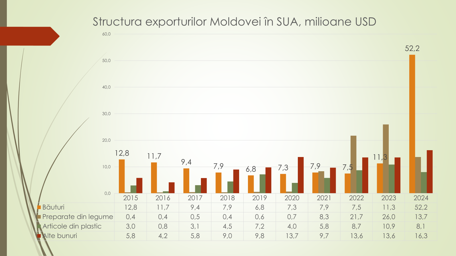 Cu referire la structura exporturilor Republicii Moldova în SUA, Veaceslav Ioniță susține că în 2015, s-au exportat băuturi de 12,8 mil/USD, preparate din legume – de 0,4 mil/USD, articole din plastic – de 3 mil/USD, iar alte bunuri – de 5,8 mil/USD. 2019: băuturi – 6,8 mil/USD, preparate din legume – 0,6 mil/USD, articole din plastic – 7,2 mil/USD, alte bunuri – 9,8 mil/USD. 2021: băuturi – 7,9 mil/USD, preparate din legume – 8,3 mil/USD, articole din plastic – 5,8 mil/USD, alte bunuri – 9,7 mil/USD. 2023: băuturi – 11,3 mil/USD, preparate din legume – 26 mil/USD, articole din plastic – 10,9 mil/USD, alte bunuri – 13,6 mil/USD. 2024: băuturi – 52,2 mil/USD, preparate din legume – 13,7 mil/USD, articole din plastic – 8,1 mil/USD, alte bunuri – 16,3 mil/USD.