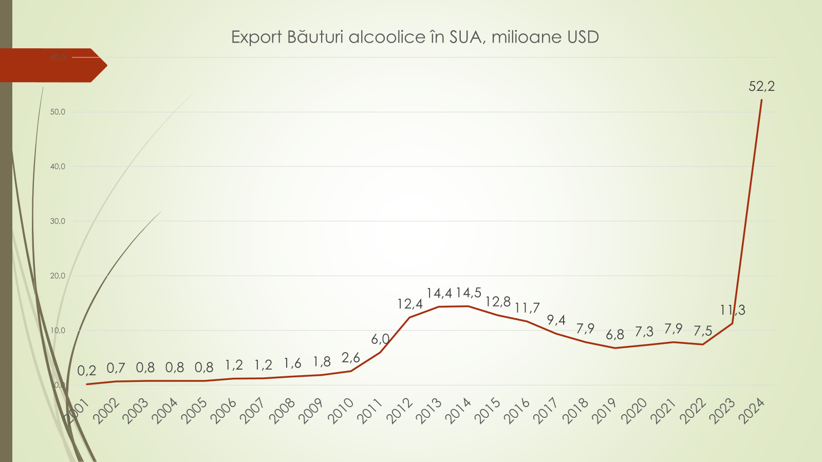 Analizând exportul de băuturi alcoolice în SUA, Veaceslav Ioniță a spus că în 2001 a totalizat 0,2 mil/USD. În 2005 – 0,8 mil/USD; 2010 – 2,6 mil/USD; 2014 – 14,5 mil/USD; 2019 – 6,8 mil/USD; 2021 – 7,9 mil/USD; 2022 – 7,5 mil/USD; 2023 – 11,3 mil/USD; iar în 2024 – 52,2 mil/USD. Potrivit lui Veaceslav Ioniță, exporturile de băuturi alcoolice moldovenești pe piața SUA, în perioada anilor 2001/2005 a deținut o cotă de 0,3%. Între 2006/2010 – 1%. 2011/2015 – 6%. 2016/2020 – 4,3%. 2021 – 3,4%; 2022 – 3,3%; 2023 – 4,9%; iar în 2024 – 19,2%. „În ultimii trei ani, creșterea exporturilor de băuturi alcoolice moldovenești se datorează creșterii exporturilor spre SUA, care a devenit una dintre principalele piețe de desfacere pentru băuturile alcoolice din Republica Moldova. În 2024, circa 20% din toată producția alcoolică exportată de către Republica Moldova a fost în SUA. Recordul precedent din 2014/2015 a fost de 7,5-8,0%”, a spus Veaceslav Ioniță.