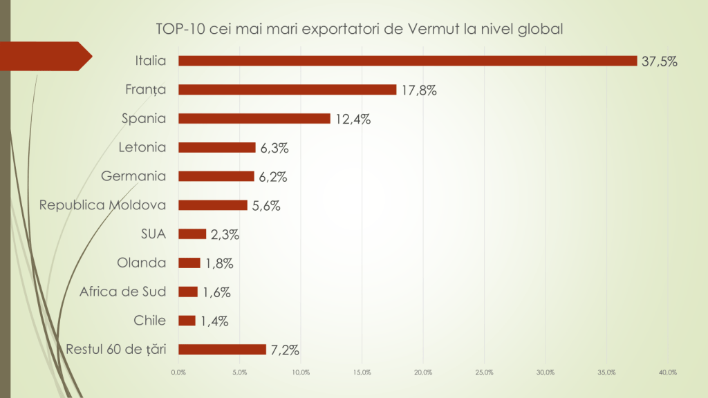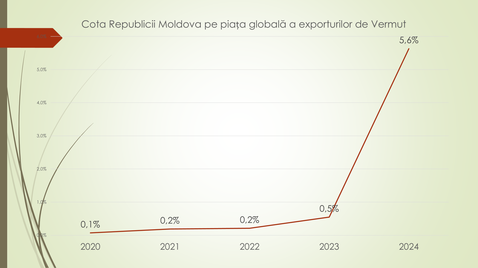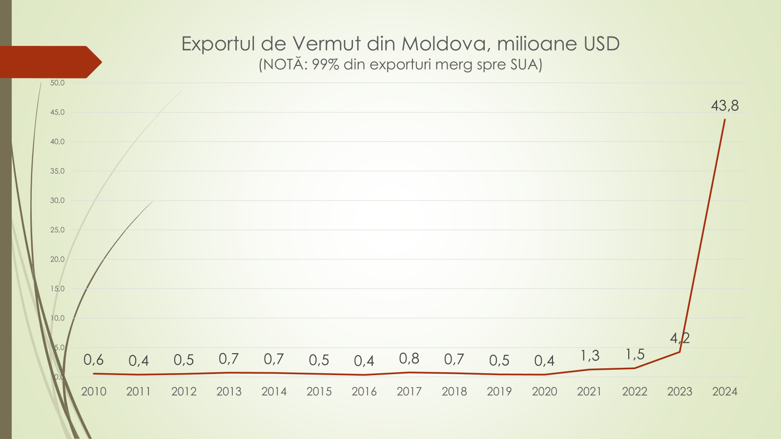 Potrivit expertului, anterior acest produs, deși se fabrica, era exportat în volume mici. Însă, în 2024, Republica Moldova a devenit al șaselea cel mai mare exportator de vermut din lume, deținând o cotă de 5,6%. Pe primele cinci poziții au fost: Italia – 37,5%; Franța – 17,8%; Spania – 12,4%; Letonia – 6,3%; Germania – 6,2%; SUA – 2,3%; Țările de Jos – 1,8%; Africa de Sud – 1,6%; Chile – 1,4%; restul 60 de țări care produc vermut – 7,1%. Republica Moldova, pe piața globală a exporturilor de vermut, dacă în 2020 a deținut o cotă de 0,1%; în 2021 – 0,2%; 2021 – 0,2%; 2023 – 0,5%; în 2024 a ajuns 5,6%. „Dintre vermuturile importate în SUA, fiecare a cincea sticlă este din Republica Moldova”, spune expertul.
