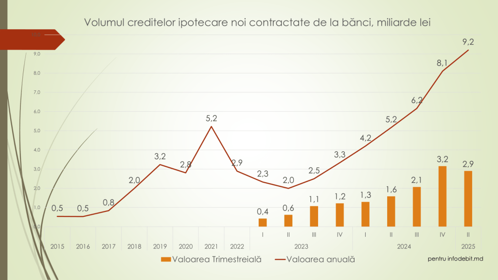 - În valoare anuală am ajuns la 9,2 miliarde lei, un nou record istoric pentru Moldova, iar proiecția pentru 2025 indică o posibilă depășire a pragului de 11 miliarde lei pe an, ceea ce va fi cel mai mare volum anual de credite ipotecare acordate vreodată în Moldova.
