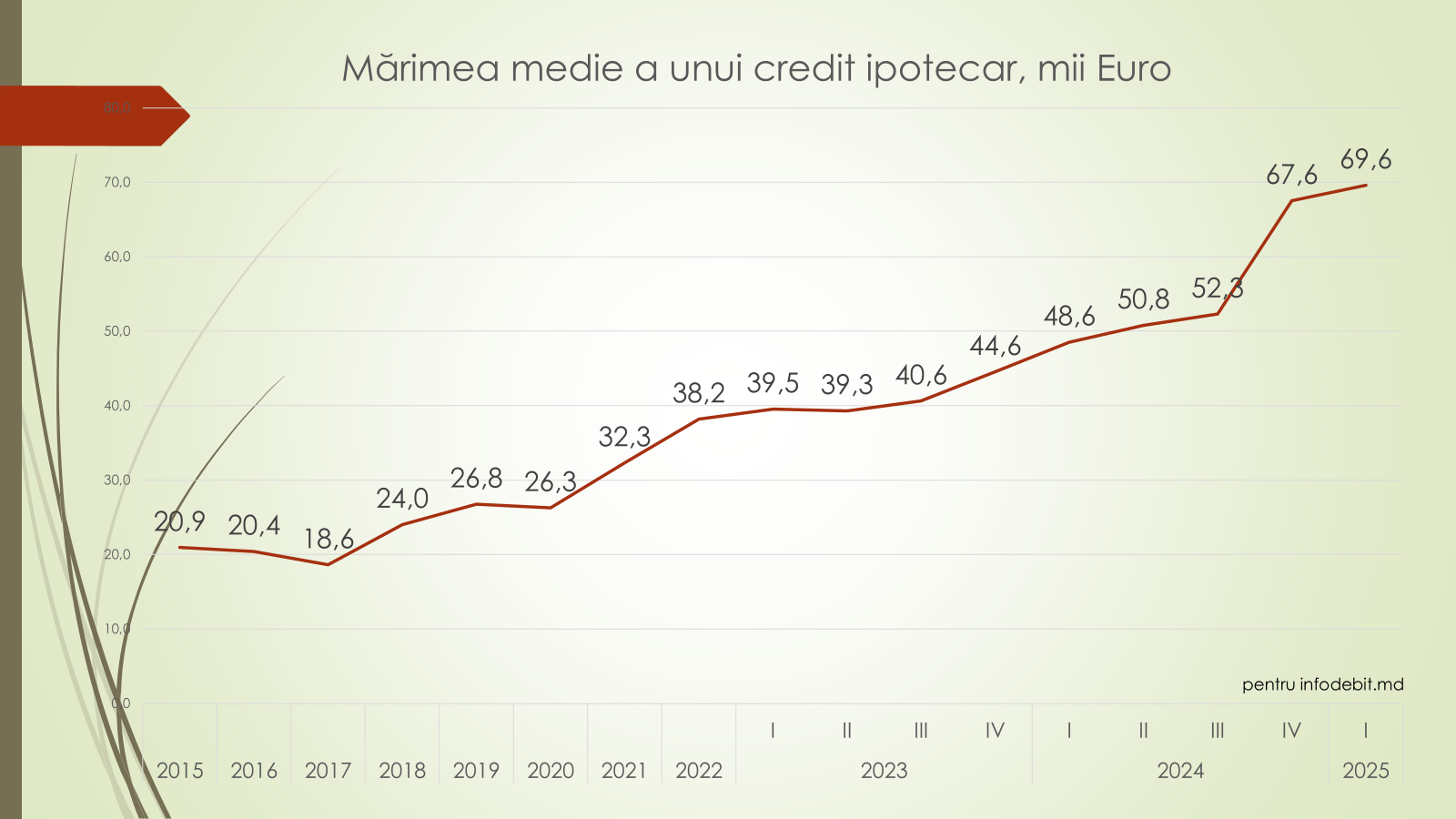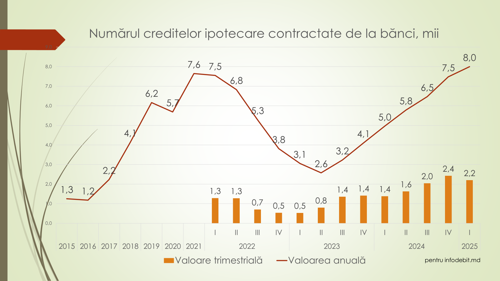 - În valoare anuală am ajuns la 9,2 miliarde lei, un nou record istoric pentru Moldova, iar proiecția pentru 2025 indică o posibilă depășire a pragului de 11 miliarde lei pe an, ceea ce va fi cel mai mare volum anual de credite ipotecare acordate vreodată în Moldova.