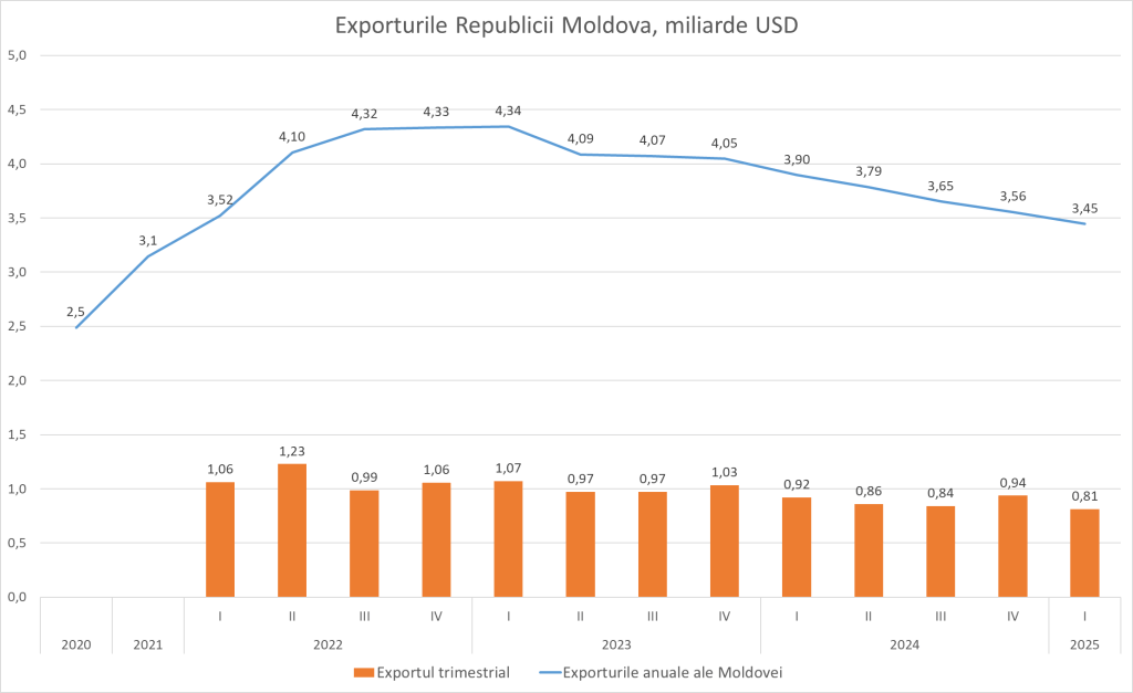 În valaore anuală exporturile Moldovei în T1/2025 au ajuns la doar 3,45 miliarde USD, cu aproape 900 milioane USD mai puțin decât în 2022, marcând o cădere continuă pe parcursul a doi ani .