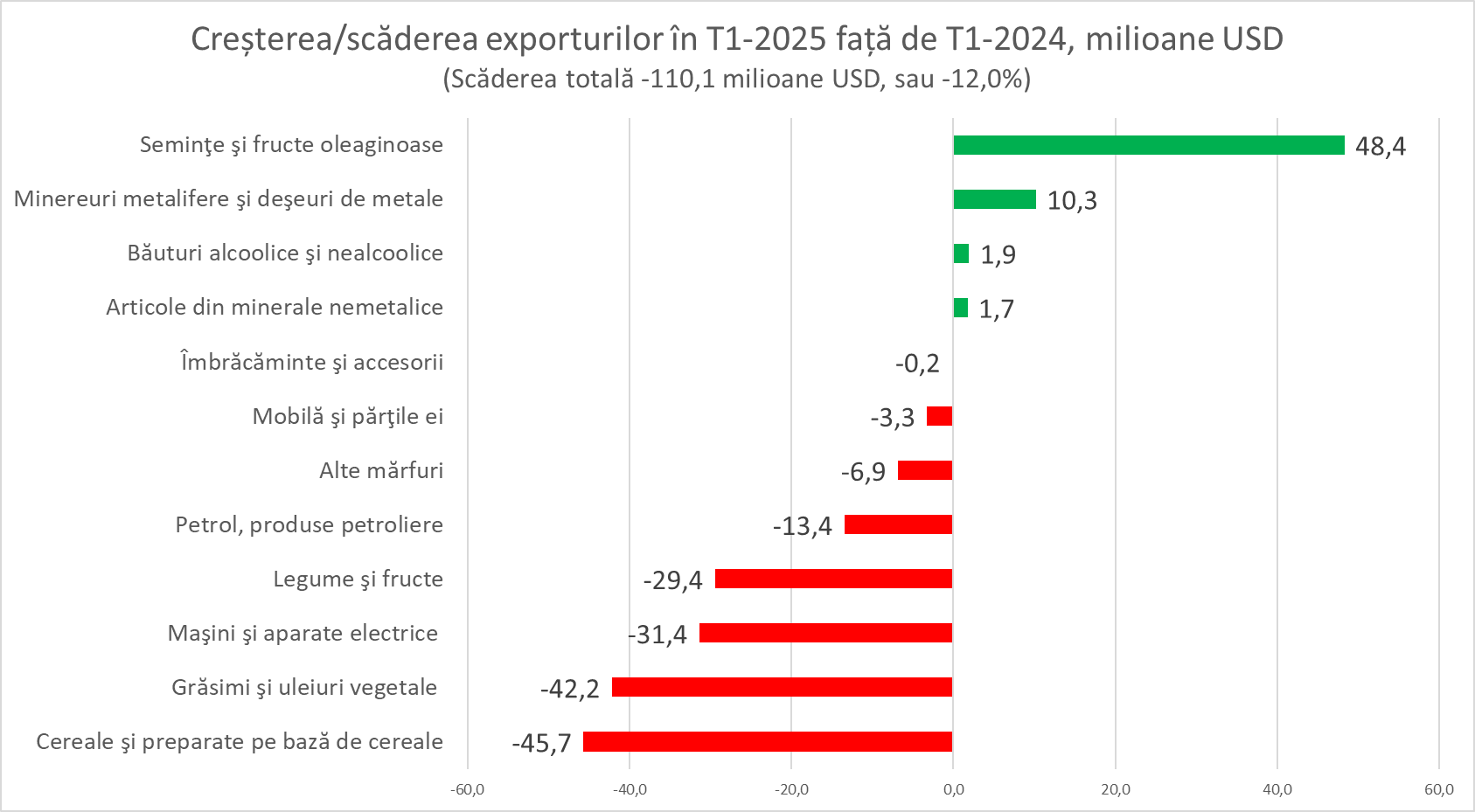 • Grăsimi și uleiuri vegetale: scădere de 42,2 milioane USD;
