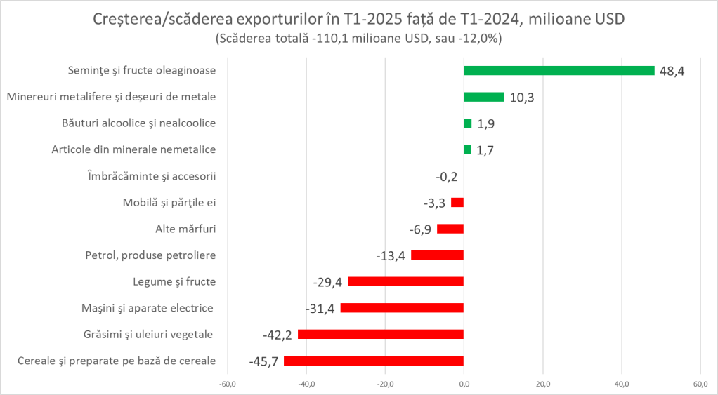 Situația cerealelor este determinată în principal de un an agricol slab în 2024, iar scăderea uleiului vegetal se datorează tranziției Moldovei de la exportator de produse finite (ulei) la exportator de materie primă (semințe), cu o creștere de 48,4 milioane USD la exporturile de semințe oleaginoase, dar cu pierderea valorii adăugate250515_ME059_Exporturi .