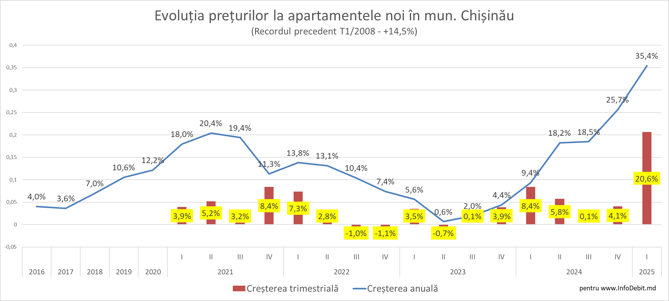 Primul trimestru din 2025 a adus o creștere șocantă a prețurilor apartamentelor noi în Chișinău: +20,6% față de trimestrul anterior, atingând un record istoric de 1.906 euro/m². Este cea mai mare creștere trimestrială din istoria Republicii Moldova, depășind precedentul record din T1/2008 (+14,5%). Creșterea anuală a ajuns la 35,4%, depășind cu mult toate valorile din ultimul deceniu.
