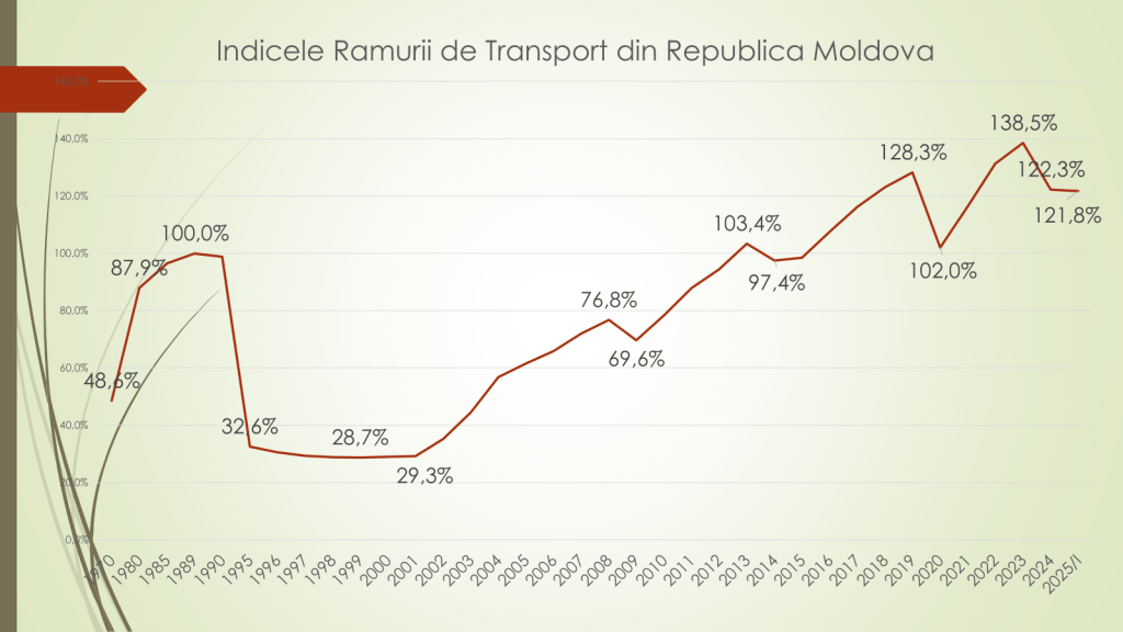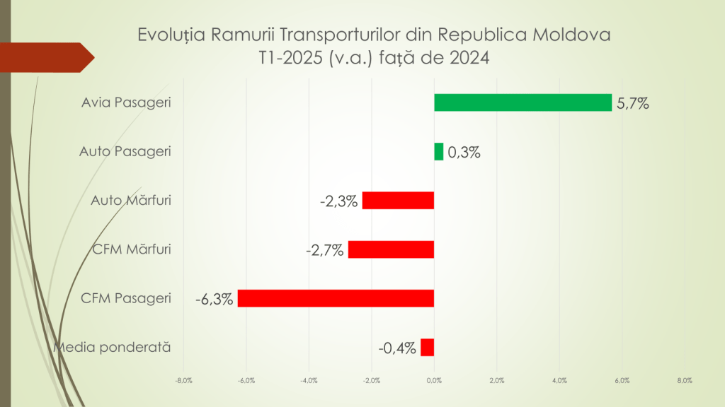 În primul trimestru din 2025, în valoarea anuală, activitatea ramurii de transport a înregistrat o ușoară scădere, în special transportul de mărfuri. Activitatea transportului auto a scăzut cu 1,4%, iar a transportului feroviar – cu 2,8%. Pe de altă parte, activitatea transportului avia a avut o creștere de 5,7%. Datele au fost prezentate vineri, 30 mai, 2025, de către Veaceslav Ioniță, expert în politici economice la IDIS „Viitorul”, în cadrul emisiunii săptămânale „Analize economice cu Veaceslav Ioniță”.