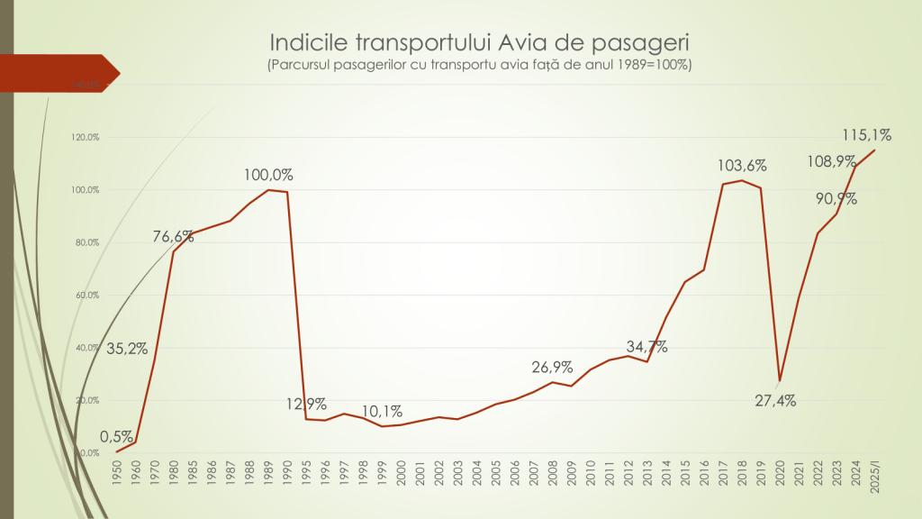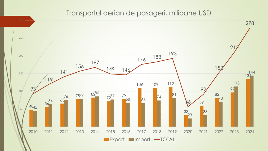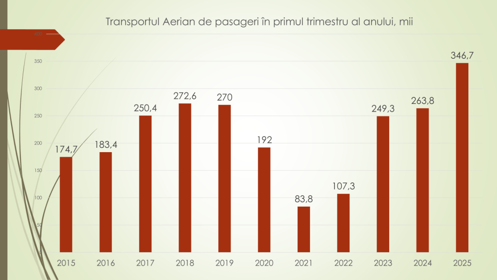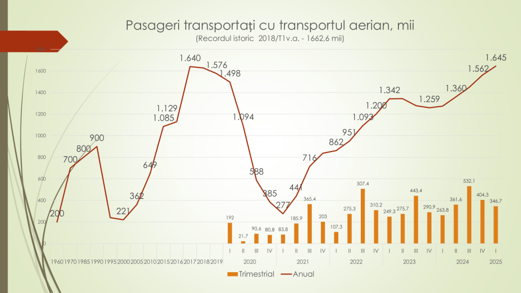 În primele trei luni ale anului curent, în valoare anuală, 1,64 mln/pasageri au zburat din Chișinău. Ultima dată, 1,66 mln/pasageri, în valoare anuală, au zburat din Chișinău, în trimestrul unu din 2018. „2025 poate fi considerat anul transportului aerian. În acest an, în această ramură vor fi bătute câteva recorduri, datorită cetățenilor ucraineni, care zboară intens din Chișinău, dar și a faptului că în ultimii ani, a crescut foarte mult cursele charter de vacanță. În 2019 piața transportului avia de pasageri a fost de 193 de milioane de dolari, iar în 2024 a crescut la 278 de milioane de dolari”, a spus expertul.