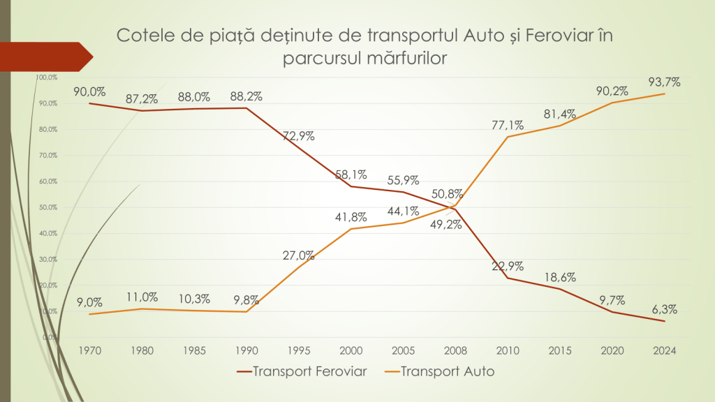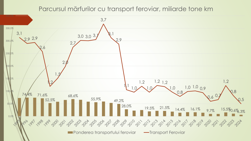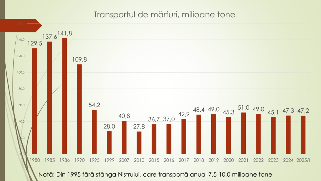 Economistul afirmă că Republica Moldova a schimbat paradigma de transport a mărfurilor. Până în 1990, mărfurile în proporție de 90% erau transportate pe calea ferată. Astăzi, 94% din toate mărfurile moldovenești sunt realizate cu transportul auto. Dacă în 2002, căile ferate transportau 14 mln/tone de mărfuri, în prezent transportă 2,4 mln/tone. Cel mai mic nivel din istoria țării. Dacă în 2005, transportul auto realiza 2,4 mlrd/tone/km în 2024 a ajuns să transporte 7,5 mlrd/tone/km. Transportul feroviar a scăzut de la 3,7 mlrd/tone/km în 2006 la 0,5 mlrd/tone/km în 2024. „Republica Moldova are o rețea de căi ferate bună, însă pe anumite segmente are nevoie de reabilitare ca să fie deblocată activitatea de transport a mărfurilor. Cu transportul auto practic sunt distruse drumurile naționale. Republica Moldova, nemodernizând căile ferate, a permis dezvoltarea exclusivă a transportului auto, și s-a ajuns la supra încărcarea drumurilor și ca rezultat are loc distrugerea lor”, a afirmat economistul.