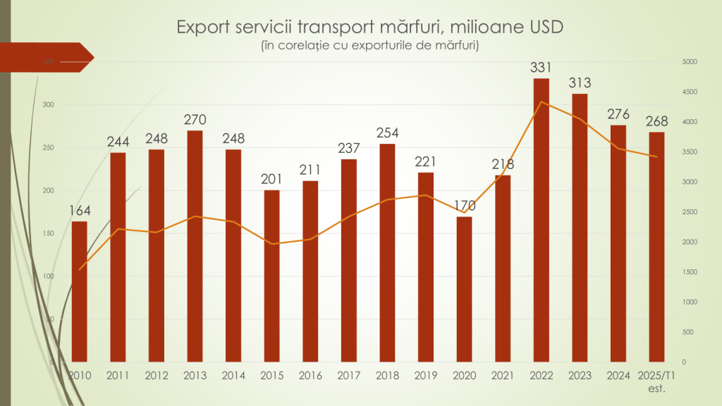 Expertul susține că de mai bine de doi ani scad exporturile de mărfuri moldovenești, dar și serviciile de transport, în special al transportului de mărfuri, deoarece se exportă mai puțin. În primul trimestru din acest an a fost înregistrată o ușoară scădere a indicelului transportului de mărfuri. Acesta a crescut constant începând cu 2010, cu excepția anilor 2014/2015, când Federația Rusă a impus embargou mărfurilor moldovenești, dar și a anului 2020, din cauza secetei agricole. În 2023 a fost înregistrată o ușoară reanimare a ramurii pe fundalul războiului din țara vecină. Însă, această activitate deja nu mai este profitabilă. În 2024 a avut loc o ușoară recuperare după șocurile prețurilor din 2021/2022/2023.
