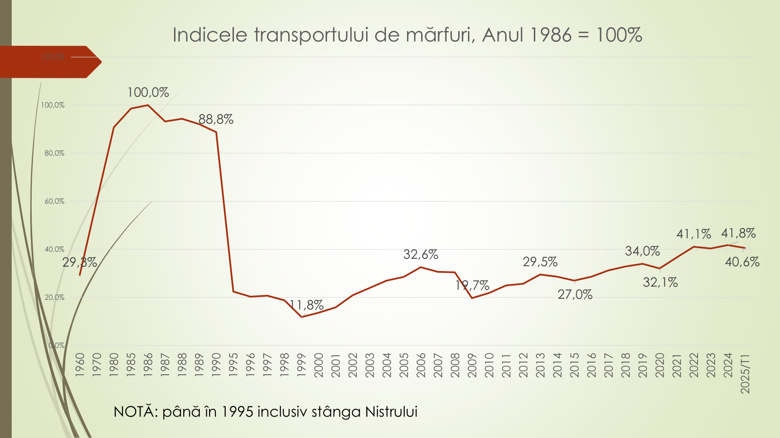 Economistul afirmă că Republica Moldova a schimbat paradigma de transport a mărfurilor. Până în 1990, mărfurile în proporție de 90% erau transportate pe calea ferată. Astăzi, 94% din toate mărfurile moldovenești sunt realizate cu transportul auto. Dacă în 2002, căile ferate transportau 14 mln/tone de mărfuri, în prezent transportă 2,4 mln/tone. Cel mai mic nivel din istoria țării. Dacă în 2005, transportul auto realiza 2,4 mlrd/tone/km în 2024 a ajuns să transporte 7,5 mlrd/tone/km. Transportul feroviar a scăzut de la 3,7 mlrd/tone/km în 2006 la 0,5 mlrd/tone/km în 2024. „Republica Moldova are o rețea de căi ferate bună, însă pe anumite segmente are nevoie de reabilitare ca să fie deblocată activitatea de transport a mărfurilor. Cu transportul auto practic sunt distruse drumurile naționale. Republica Moldova, nemodernizând căile ferate, a permis dezvoltarea exclusivă a transportului auto, și s-a ajuns la supra încărcarea drumurilor și ca rezultat are loc distrugerea lor”, a afirmat economistul.