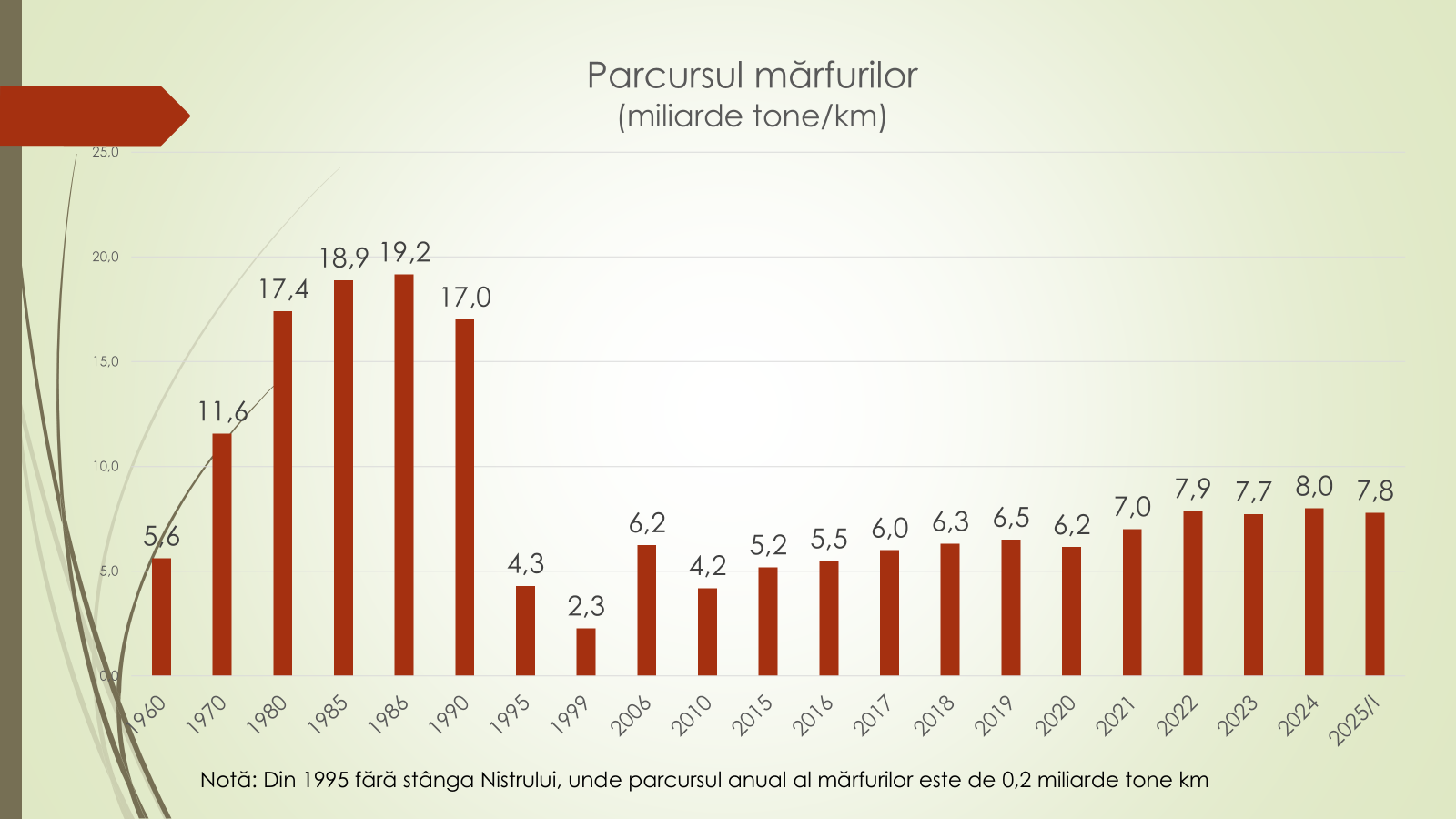 Analistul economic menționează că odată ce calea ferată nu mai era o soluție pentru transportul de mărfuri, intensiv au fost procurate autovehicule. Dacă în 2005 erau 81,8 mii de autovehicule, în primul trimestru din 2025 s-a ajuns la 225,8 mii/unități, în condițiile în care în primul trimestru din acest an, volumul de mărfuri transportat a scăzut nesemnificativ, iar numărul de unități auto a crescut. Astfel, numărul de mașini utilizate la transportul mărfurilor este mare pentru un volum de mărfuri în scădere.