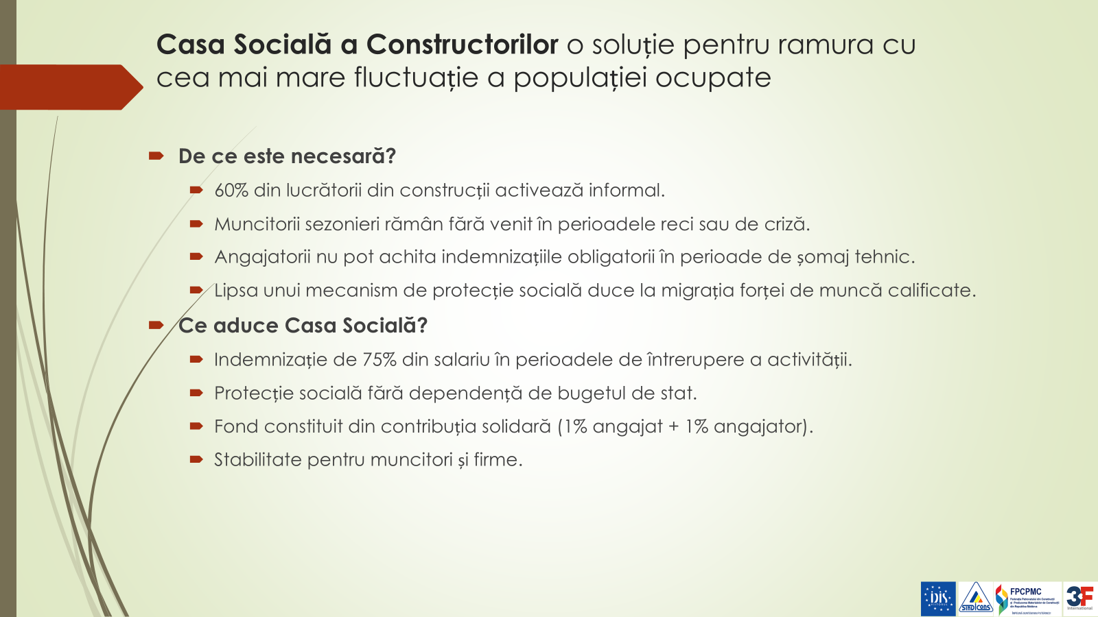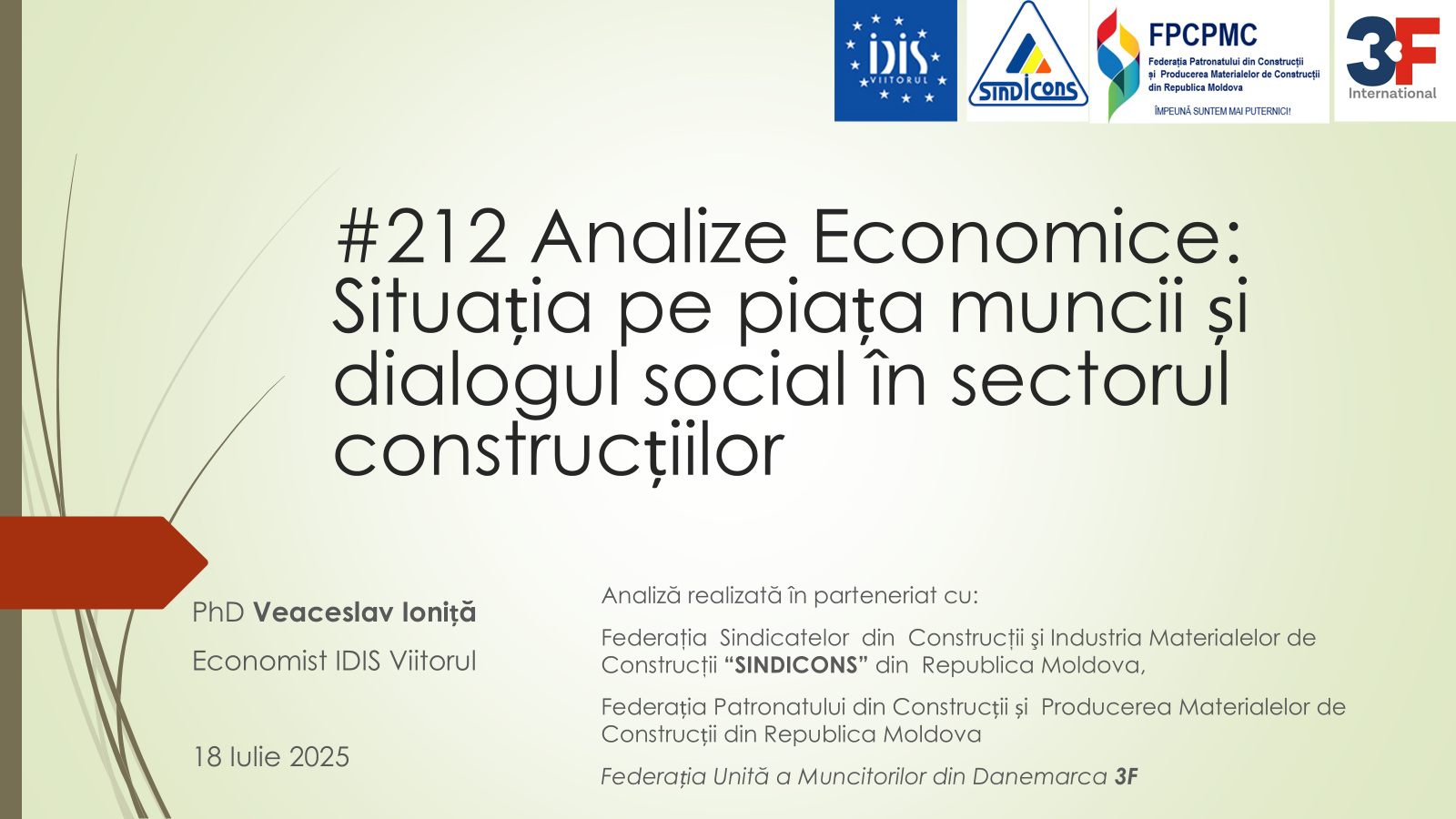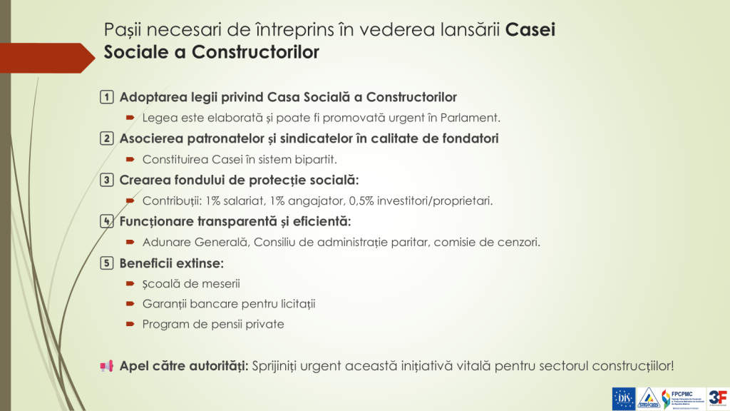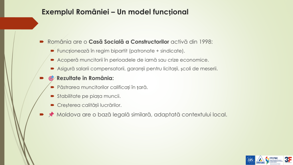 Analiza a fost realizată realizată în parteneriat cu Federația Sindicatelor din Construcții și Industria Materialelor de Construcții „SINDICONS” din Republica Moldova, Federația Patronatului din Construcții și Producerea Materialelor de Construcții din Republica Moldova și Federația Unită a Muncitorilor din Danemarca 3F.