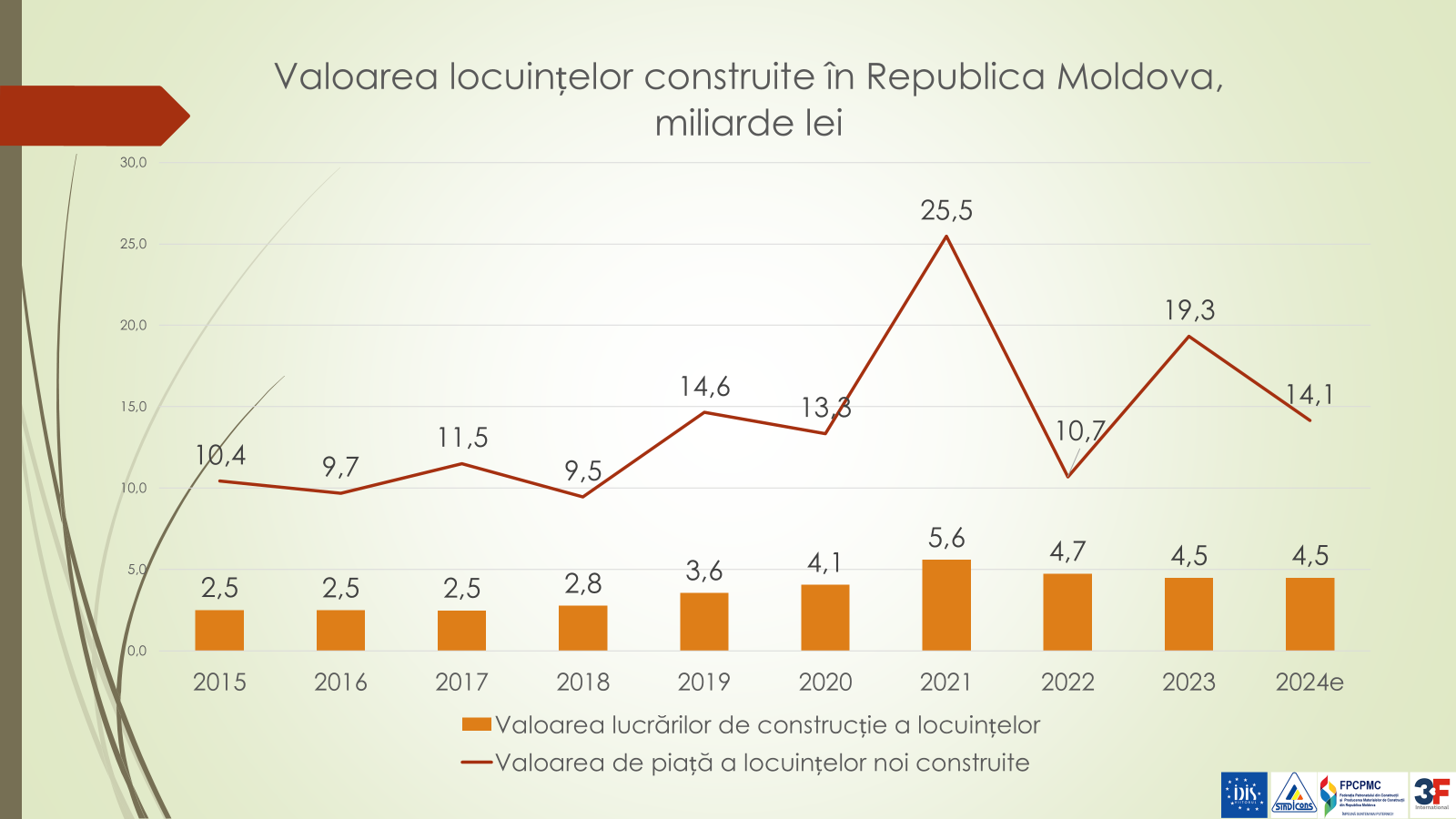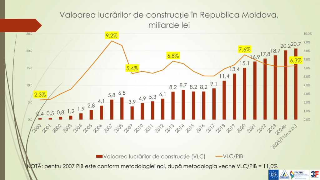 Potrivit expertului, în primul trimestru din acest an, în valoare anuală, volumul lucrărilor de construcție a fost de aproape 21 de miliarde de lei (mlrd/lei). În municipiul Chișinău, în 2021, valoarea lucrărilor de construcție al locuințelor a fost estimată la 5,6 mlrd/lei, iar valoarea de piață a locuințelor noi construite – la 25,5 mlrd/lei. În 2024, valoarea lucrărilor de construcție al locuințelor a fost estimată la 4,5 mlrd/lei, iar valoarea de piață a locuințelor noi construite – 14,1 mlrd/lei.