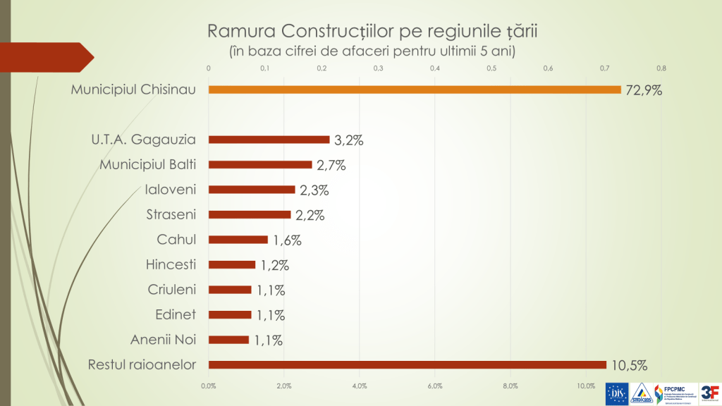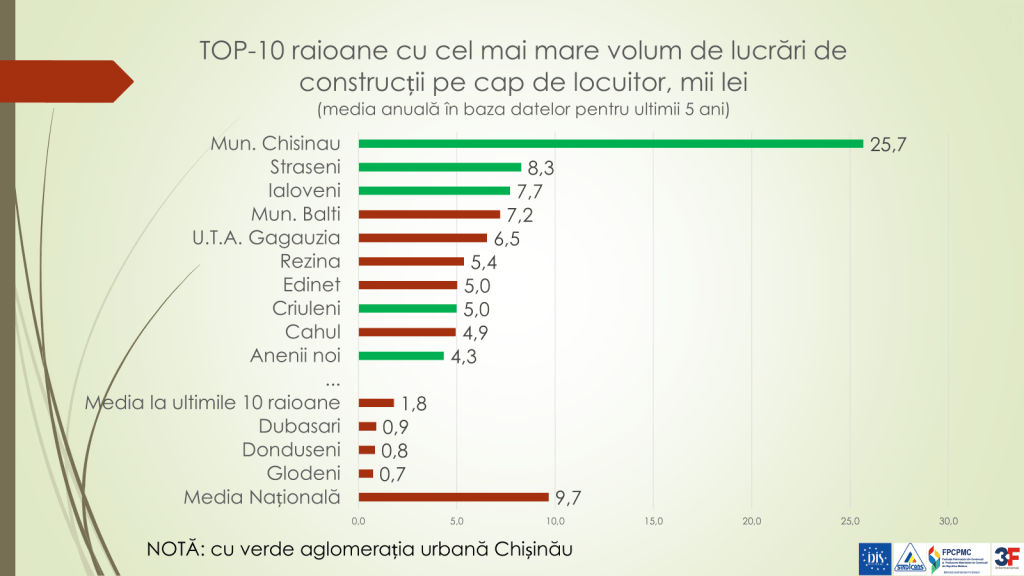 „Există o discrepanță mare dintre volumul construcțiilor din municipiul Chișinău și restul teritoriul Republicii Moldova. În ultimii cinci ani, 72,9% sau 3 din 4 lucrări de construcție, ca volum de bani, s-a realizat în municipiul Chișinău. Aici se construiesc cele mai multe locuințe. În ultimii cinci ani, în municipiul Chișinău, volumul construcțiilor pe cap de locuitor a fost estimat la 25,7 mii de lei (mii/lei), urmat de municipiul Strășeni cu 8,3 mii/lei pe cap de locuitor. Investițiile și lucrările de construcție în majoritatea raioanelor țării sunt de 25 de ori mai mici”, a spus expertul.