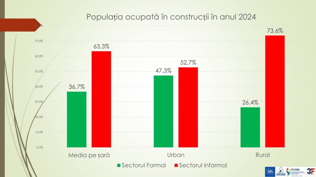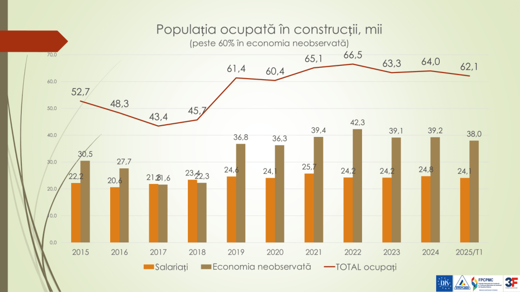 Veaceslav Ioniță susține că problema cu care se confruntă ramura construcției este faptul că 60% din populația ocupată în acest domeniu activează în sectorul neformal. În 2024, în sector au lucrau 64 de mii de persoane, dintre care 24 800 erau salariate, iar 39 200 au muncit la negru. Totodată, anual, 40% dintre angajații ramurii de construcții sunt noi veniți. Acest fapt vorbește despre faptul că în această ramură nu există creștere profesională, deși cei care vin să lucreze în domeniu, sunt în mare parte tinerii. Dacă în zonele urbane 50% activează oficial și 50% neoficial, în zonele rurale – doar 26,4% sunt angajați oficial., iar restul 73,6% nu sunt asigurați medical și social.