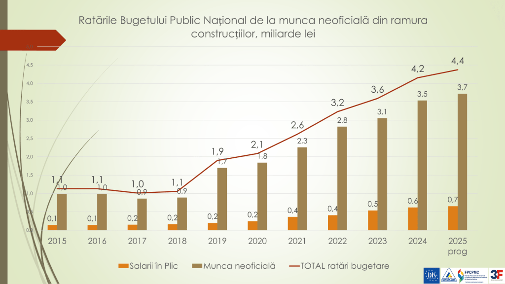 Economistul a declarat că salariul în ramura construcției, până în anii 1990 a fost cu circa 15% mai mare decât media pe economie. După anii 1990 și până în 2005, în unii ani, a fost chiar și cu 50% mai mare. În prezent este cu 15% mai mic. Însă, o bună parte dintre cei care activează în ramura construcției primesc salariul în plic. Salariul real pe care îl primește o persoană angajată oficial este cu 15-20% mai mare decât media pe economie. Partea proastă este că nu tot salariul îl primește oficial. Pe lângă faptul că 60% activează neoficial, dintre acei 40% angajați oficial, 25% din salariu îl primesc neoficial. Ca rezultat, în 2024, din neachitarea asigurărilor sociale, medicale, dar și alte taxe și impozite, de către o parte a angajaților din ramura construcției, ratările bugetului public național din munca neoficială au fost de 4,2 miliarde de lei. În 2023 s-au ratat 3,6 miliarde de lei, iar în 2022 – 3,2 miliarde de lei.