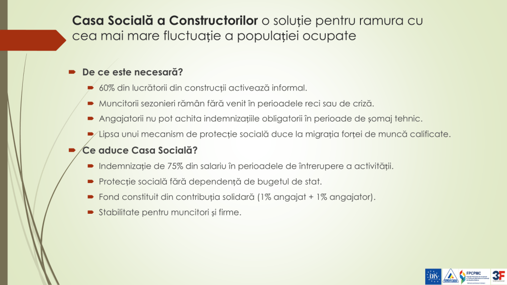 „În România, un angajat din ramura construcției, în perioada în care nu lucrează, primește 75% din salariul pe care îl are în perioada când are activitate. Dacă ai contribuția angajatorului, angajatului și a investitorului, este asigurată protecția ramurii. Protejând această ramură, care este motorul unei economii, este protejat fiecare dintre noi. Ramura construcției, unde se înregistrează o fluctuație anuală excesivă a angajaților, unde nu poate fi garantată calitatea unei bune execuții a i construcțiilor, trebuie scoasă din zona neobservată a economiei în zona observată. Cu asemenea tendințe pe care le avem în prezent este imposibil să dezvolți o ramură și să crești profesioniști”, a conchis expertul.