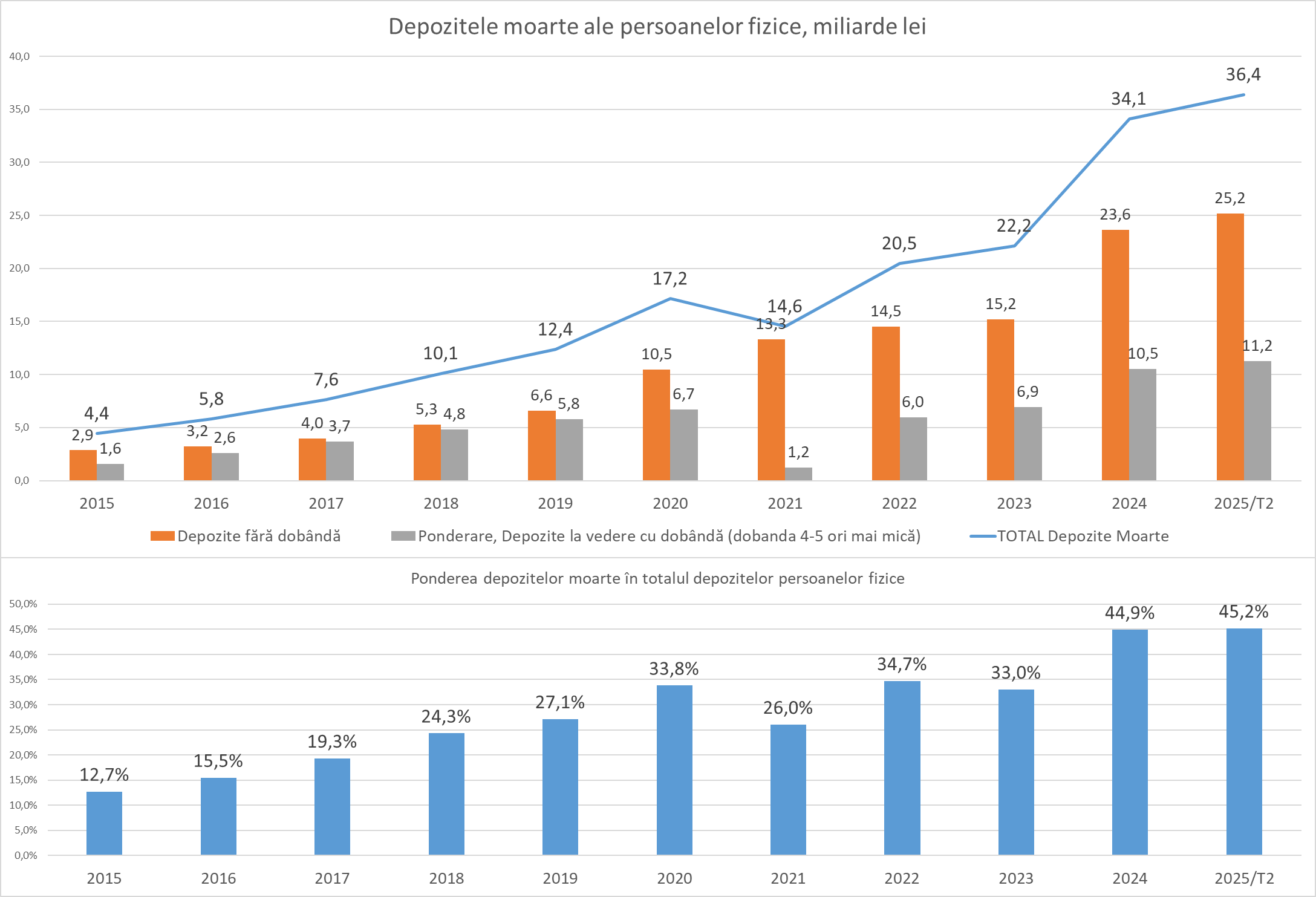 36,4 miliarde lei în așa-numite „depozite moarte” – adică fără dobândă sau cu dobândă simbolică (sub 1%).