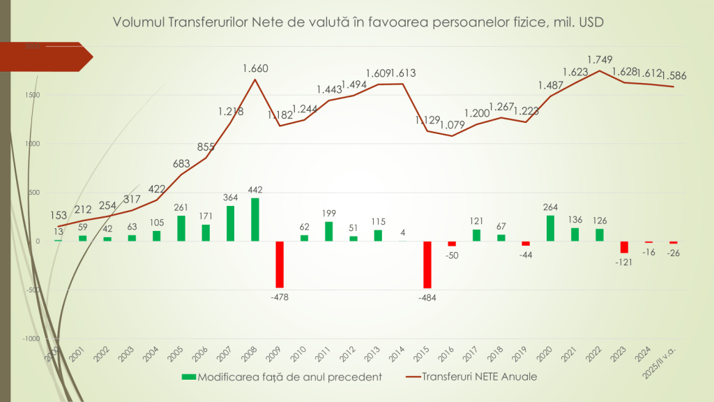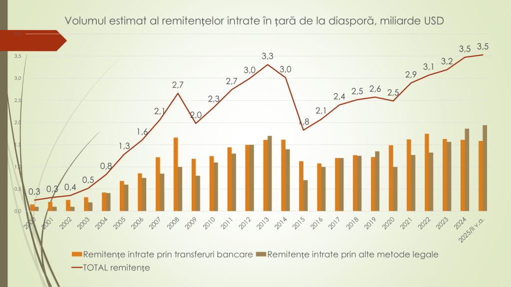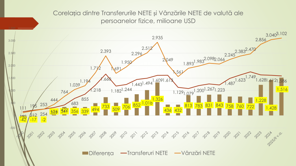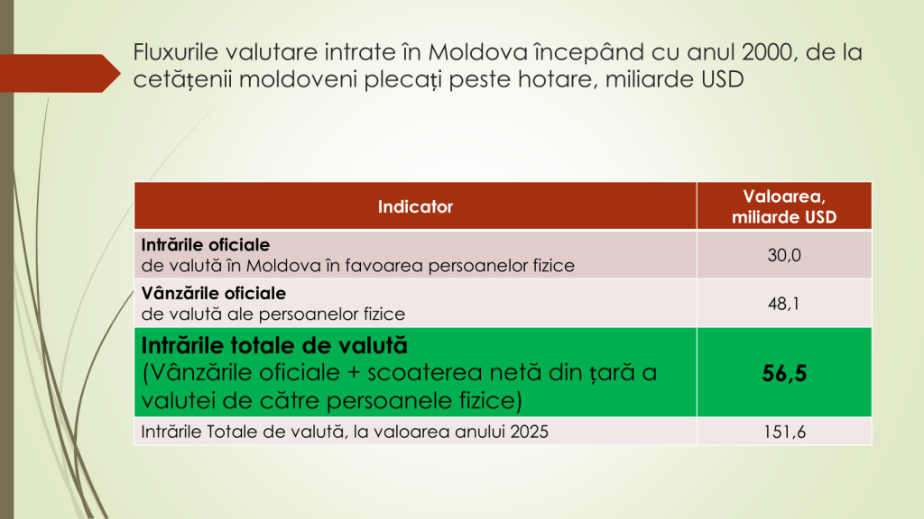 Economistul afirmă că dacă în prima jumătate a anului volumul de bani pe care moldovenii l-ar fi trimis acasă este de 3,5 mlrd/USD, atunci din 2000 și până în prezent, timp de 25 de ani, s-au trimis 56,5 mlrd/USD. La valoarea anului 2025 – 151,6 mlrd/USD. Intrările oficiale de valută pentru persoanele fizice au fost 30 mlrd/USD, iar vânzările oficiale – 48 mlrd/USD. Astfel, 18 mlrd/USD au intrat în țară pe alte căi.
