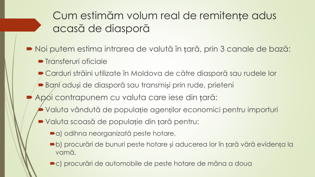 Potrivit lui Veaceslav Ioniță, volumul transferurilor de valută în favoarea persoanelor fizice, prin sistemul bancar, pentru prima jumătate a anului curent, în valoare anuală a ajuns la circa 1,58 mln/USD, iar cei mai mulți bani moldovenii din diasporă i-au trimis acasă a fost în 2022 – 1,74 mln/USD. Estimativ în prima jumătate a anului curent, în valoare anuală, volumul de bani pe care moldovenii de peste hotare l-ar fi trimis acasă este de 3,5 mlrd/USD, dintre care transferați oficial – 1,6 mlrd/USD, iar neoficial, prin rude – 1,9 mlrd/USD. Veaceslav Ioniță susține că ar fi trei modalități prin care moldovenii trimit bani acasă: transferurile prin sistemul bancar; cardurile străine lăsate rudelor de acasă; și banii aduși personal sau transmiși prin rude.