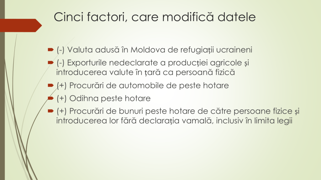 Expertul spune din 2000 și până în 2024 în Republica Moldova s-au importat peste 600 de mii de autoturisme și au fost făcute circa 7 mln de vizite ale moldovenilor peste hotare în mod individual. Aceste două elemente înseamnă că iese masiv valută din țară. Astfel, în prima jumătate a anului curent, în valoare anuală, s-au vândut 3,1 mlrd/USD. Un record absolut, însă și un paradox. „Remitențele de peste hotare scad al treilea an consecutiv, iar vânzările de valută din partea persoanelor fizice cresc de zece ani. Dacă până în 2022 diferența era de 700-750 mld/USD, banii care intrau în țară, din 2023 avem o diferență enormă. În acest an va fi o diferență de 1,5 mlrd/USD. Această diferență mare este legată și de faptul că o parte din bani sunt aduși de către ucraineni în Republica Moldova”, a spus expertul.