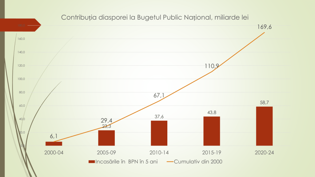Întrebându-se cât din bugetul public național este format din banii diasporei, Veaceslav Ioniță a declarat că între 2000/2005 a fost 15,5%; între 2005/2009 – 22,5%; 2010/2014 – 22,1%; 2015/2019 – 16,6%; 2020/2024 – 13,4%. Cu referire la transferurile de peste hotare raportate la PIB, a specificat că în 2000 au reprezentat 19,6%; în 2006 – 47%; 2011 – 32,6%; 2015 – 23,6%; 2020 – 21,6%; 2024 – 18,4%. „În perioada 2005/2015, practic fiecare al patrulea leu din bugetul țării era venit din diasporă. Astăzi, fiecare al șaptelea leu pe care îl are bugetul public național este de la moldovenii care muncesc peste hotare și au trimis bani acasă”, a conchis expertul.