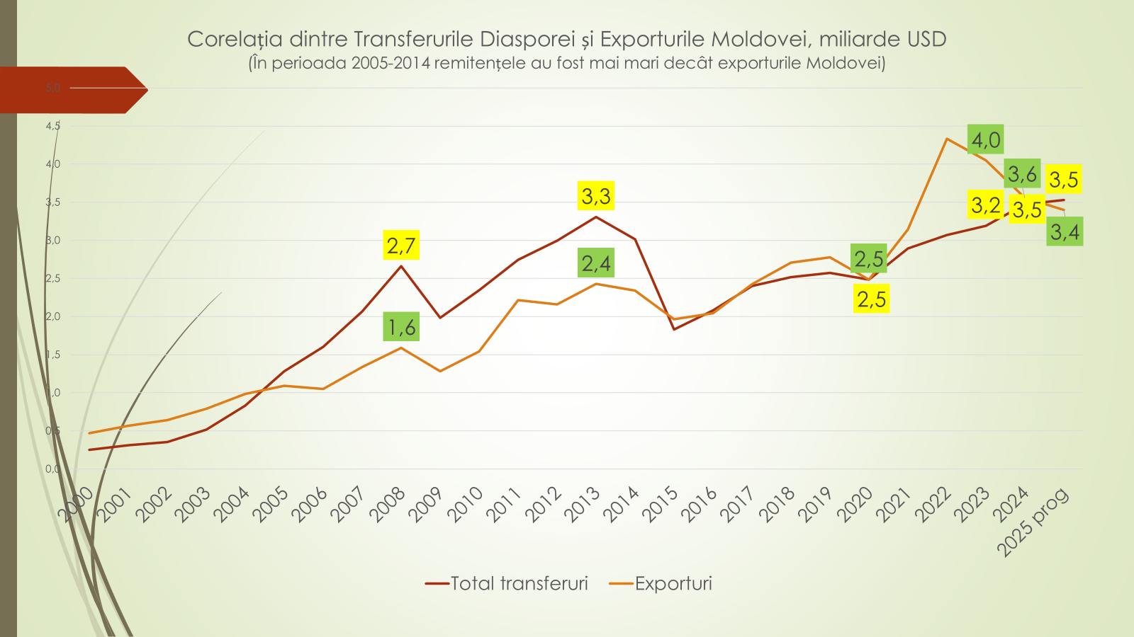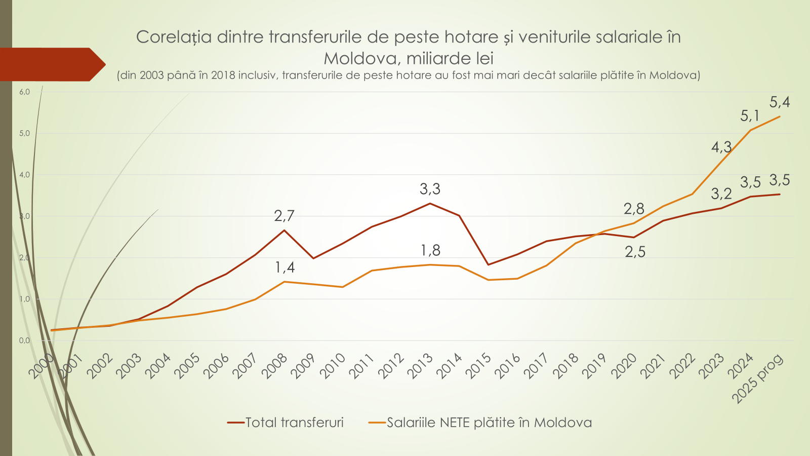 Analistul economic a menționat că în 2013, diaspora a trimis acasă 3,3 mlrd/USD, iar volumul salariilor plătite în țară a fost de 1,8 mlrd/USD. Din 2003 și până în 2018, volumul remitențelor a fost mai mare de peste două ori decât salariile achitate în Republica Moldova. În 2025, salariile plătite în Republica Moldova sunt estimate la 5,4 mlrd/USD, iar transferurile de peste hotare – la 3,5 mlrd/USD. În 2008 exporturile Republicii Moldova au fost de 1,6 mlrd/USD, iar transferurile diasporei – 2,7 mlrd/USD. Din 2005 și până în 2014, timp de zece ani, banii trimiși acasă de către moldoveni au fost mai mulți decât banii câștigați din exporturi. În acest an, având o scădere a exporturilor, remitențele vor fi tot mai mari decât banii câștigați din exporturi.
