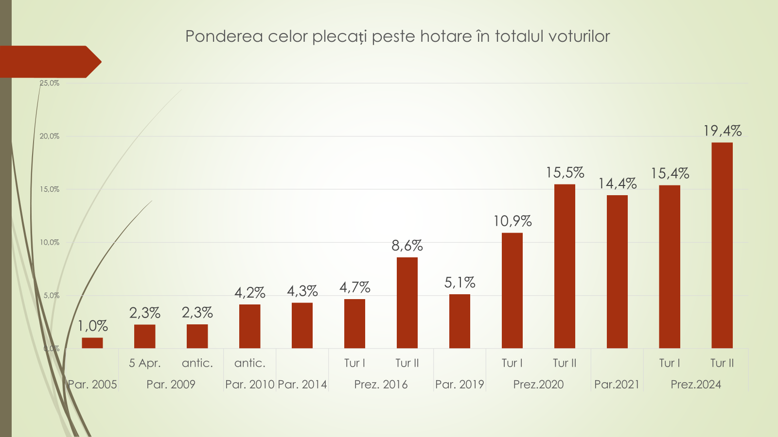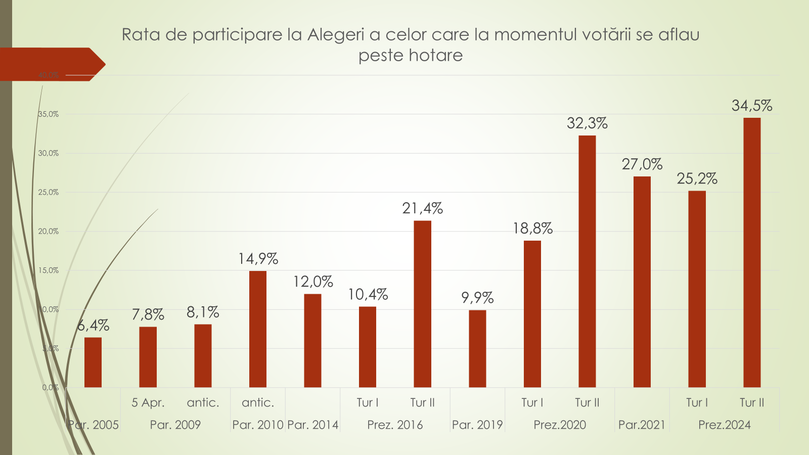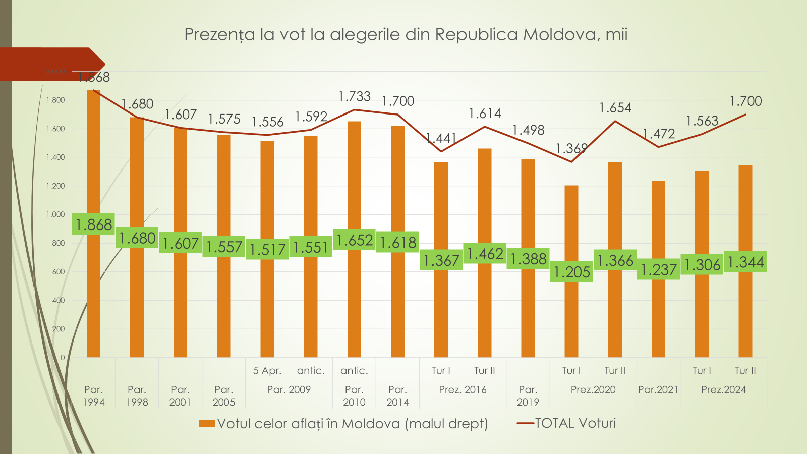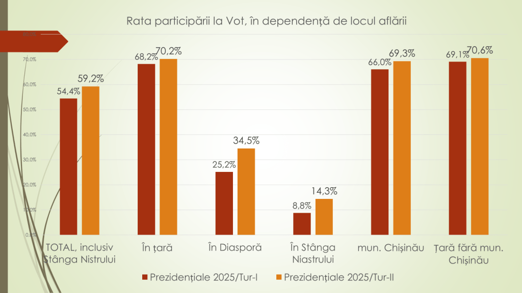 Potrivit expertului, la alegerile parlamentare din 2014 au ieșit la vot 1 milion și 700 de mii moldoveni sau 72%, dintre care 1 milion și 618 mii au votat moldovenii de pe malul drept al Nistrului, iar la parlamentare din 2021 au participat 1 milion și 472 de mii de moldoveni sau 60,2%, dintre care 1 milion și 237 de mii au fost voturile celor de acasă. La alegerile prezidențiale de acum un an, au participat, în turul întâi, 1 milion și 563 de mii de moldoveni sau 68,2%, dintre care 1 milion și 306 mii au votat de acasă, iar în turul doi, au ieșit la vot 1 milion și 700 de mii sau 70,2%, dintre care 1 milion 344 de anii au votat de pe malul drept. „Alegerile prezidențiale au o prezență mai bună la urne a cetățenilor”, a spus expertul.