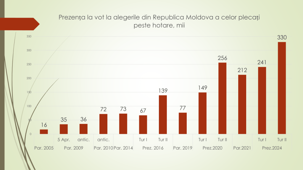 Economistul a mai spus că la alegerile parlamentare din 2014 cei de peste hotare au votat în număr de 73 de mii sau 12%. În 2021 – 212 mii sau 27%, iar în turul întâi al alegerilor prezidențiale de anul trecut au mers la urne 241 de moldoveni plecați de acasă sau 25,2% și 330 de mii în turul doi s-au 34,5%.